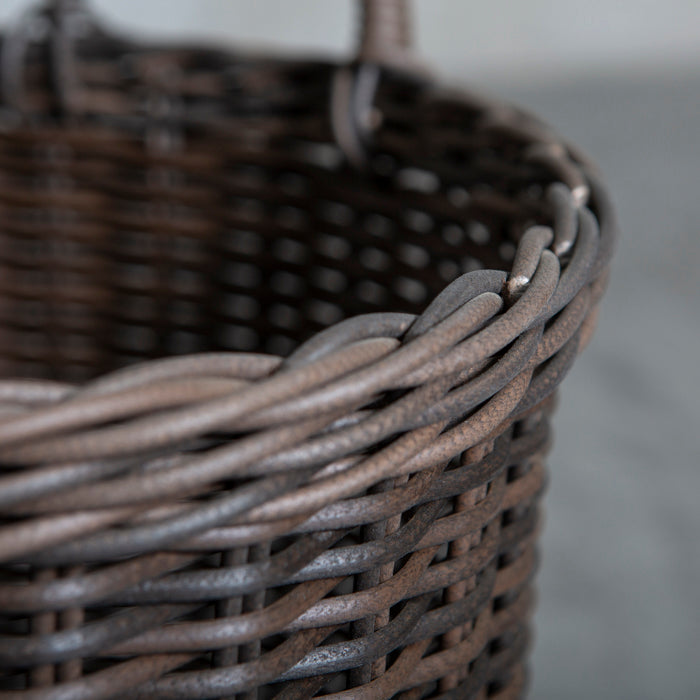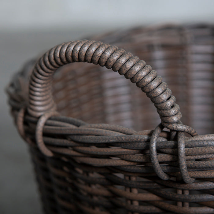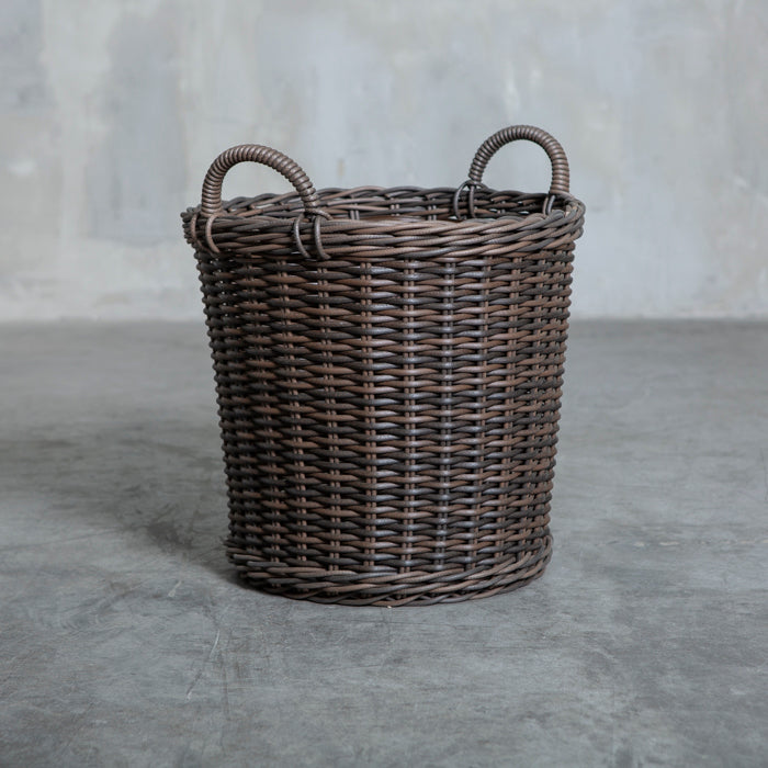 Canasto totalmente tejido en medio núcleo sintético de ratán 6 mm con un acabado color bosque gris.