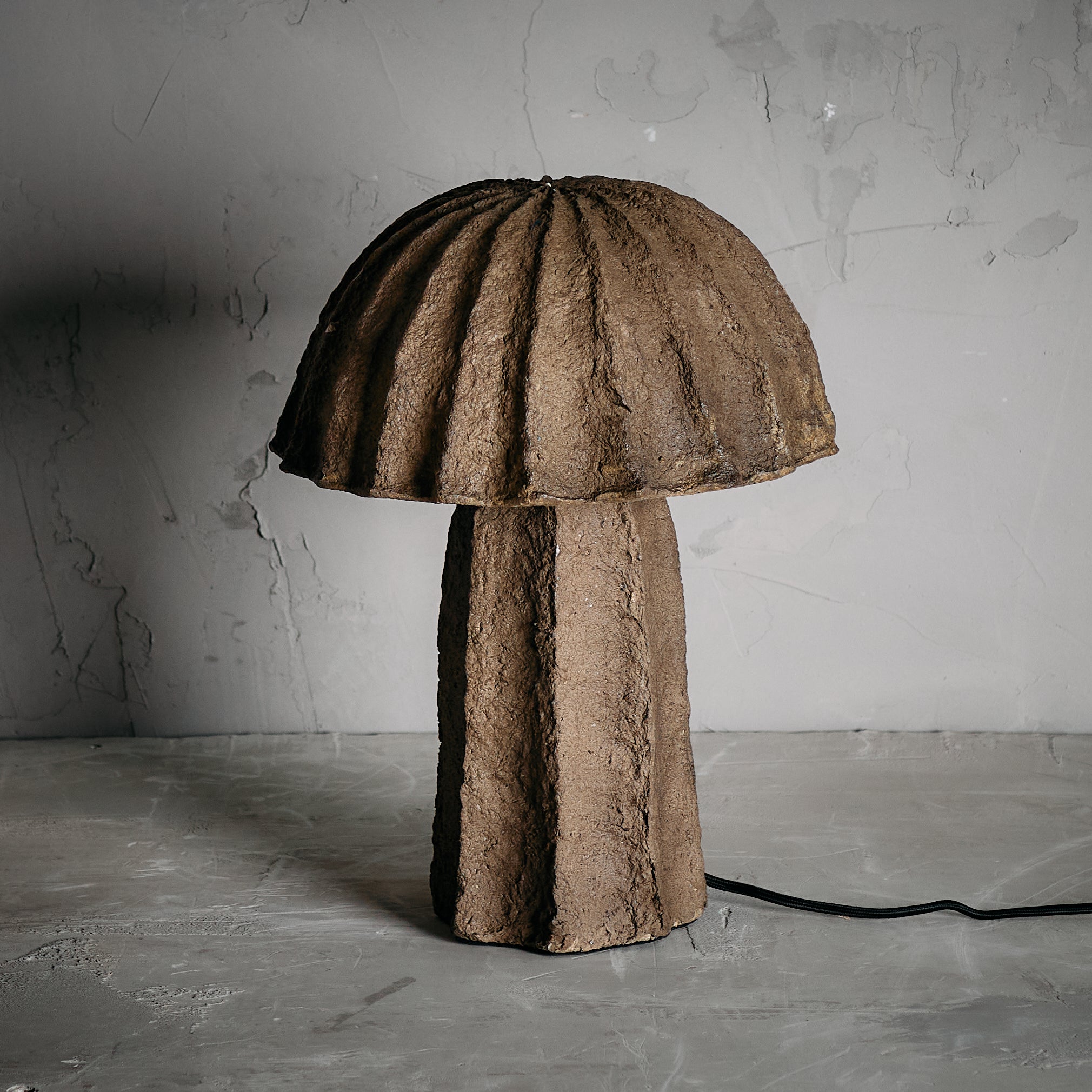 Esta lámpara de mesa combina la estética artesanal con un diseño contemporáneo. Fabricada a mano en papel maché con acabado en tono café , lo que le da una textura orgánica y un acabado ligeramente irregular.