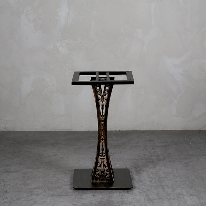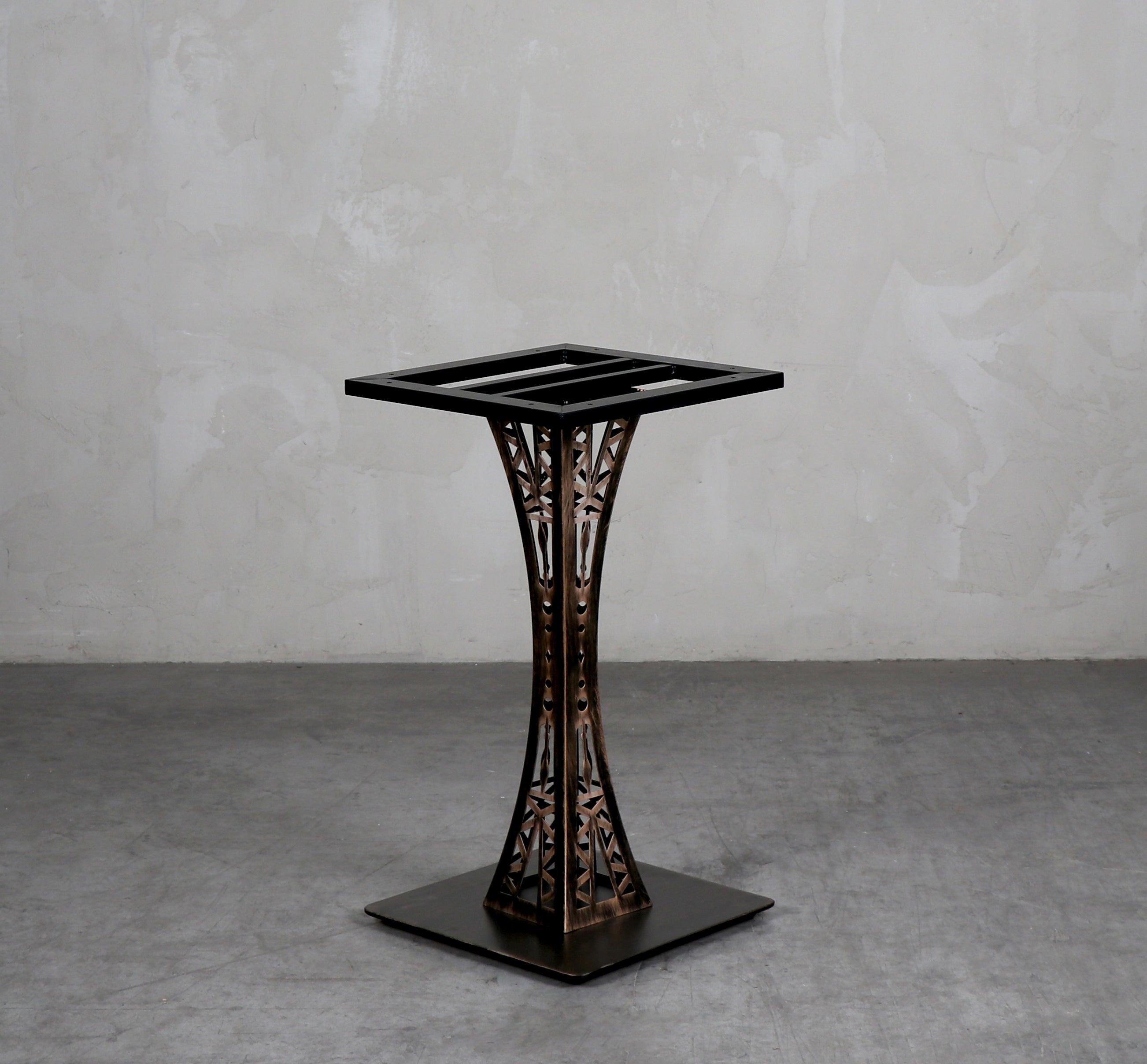 Base para mesa con estructura metálica color bronce envejecido. Medidas: base: 40 x 40 cm / tubo: 69 cm / base cubierta: 40 x 40 cm / altura: 72 cms.