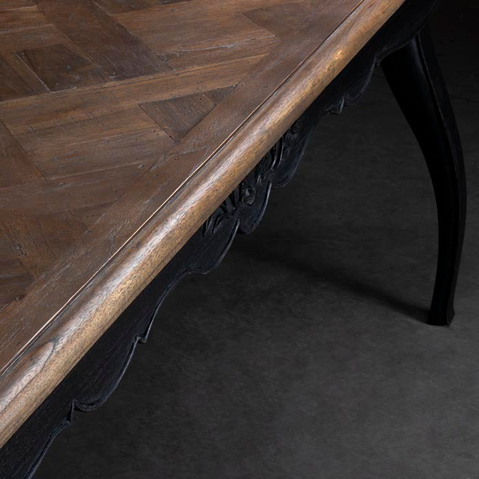 Mesa con patas de madera de mindi con terminación negra y cubierta de madera de teca   Medidas: 210 x 90 x 76 cm   largo x ancho x alto)
