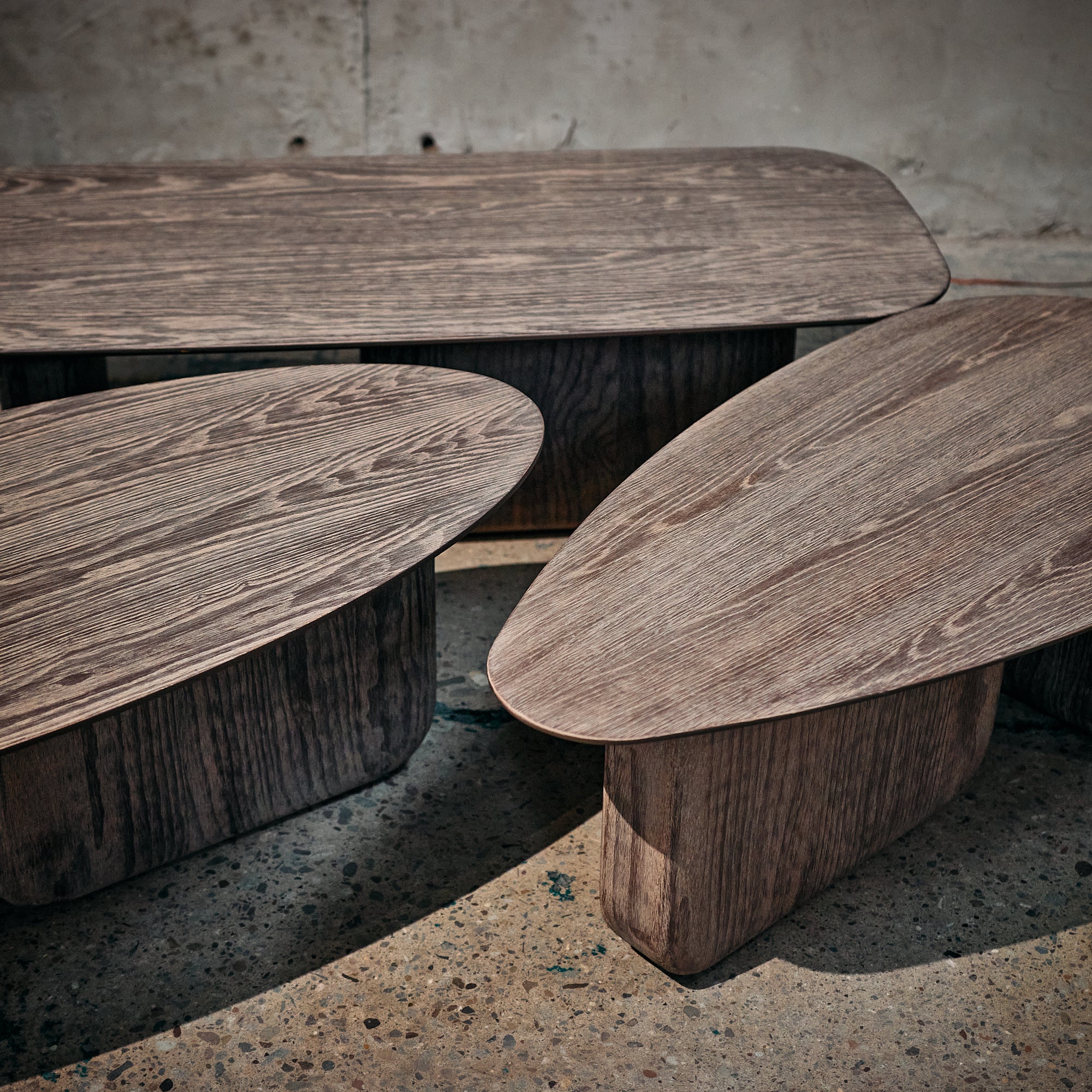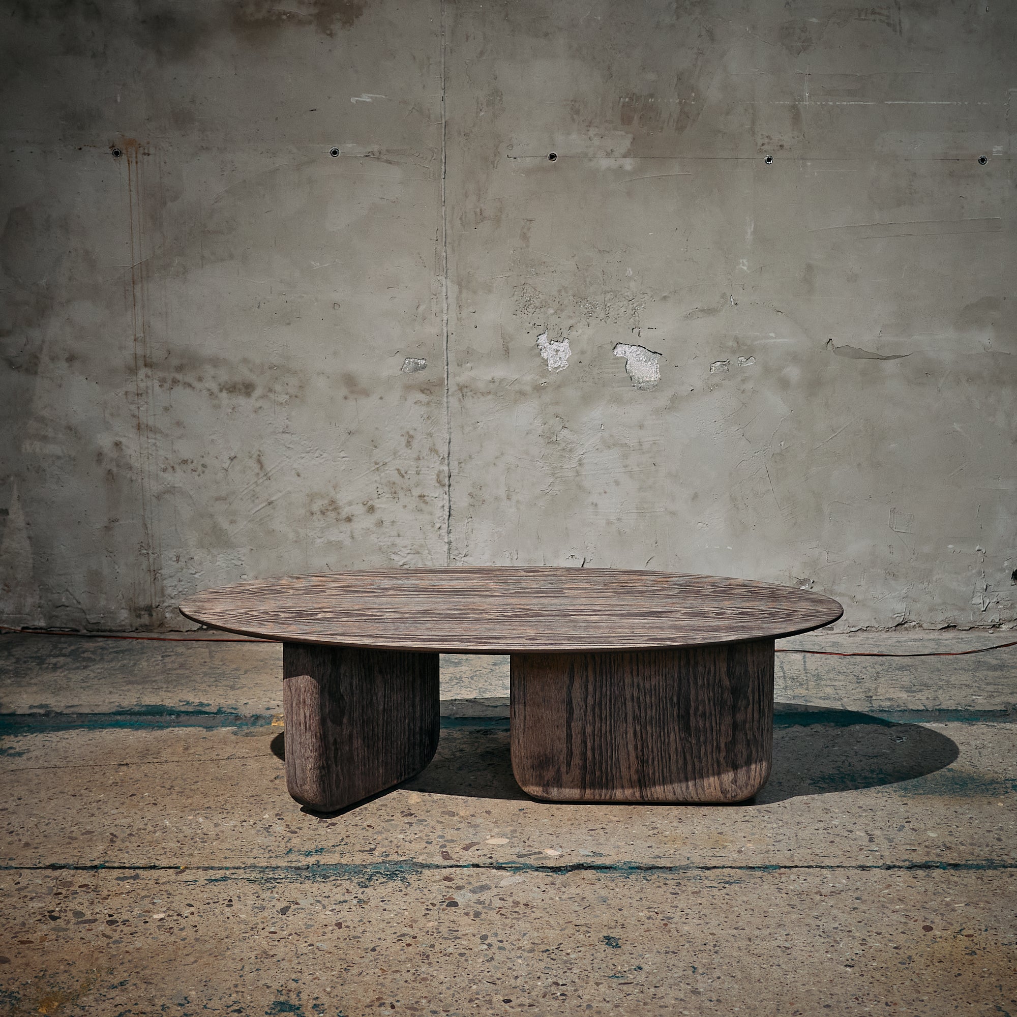 Mesa fabricada en enchape de Roble y patas de madera de Pino