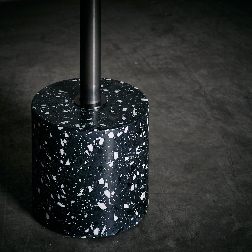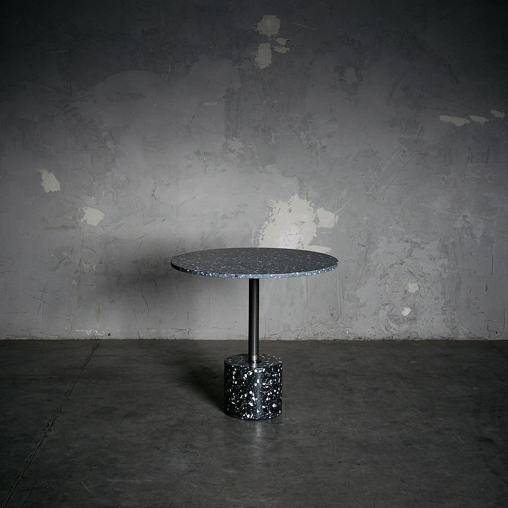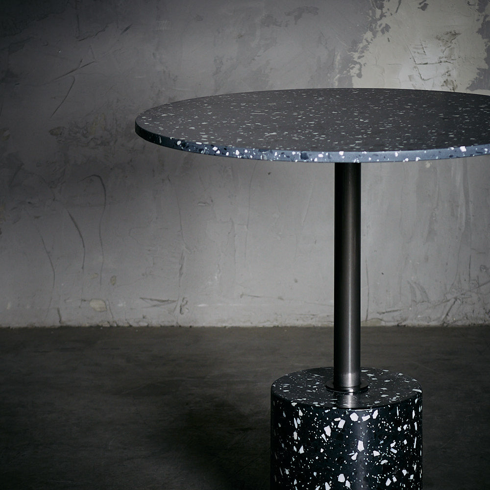 Mesa de Acero inoxidable en terminación bronce con base de terrazo color gris oscuro.
