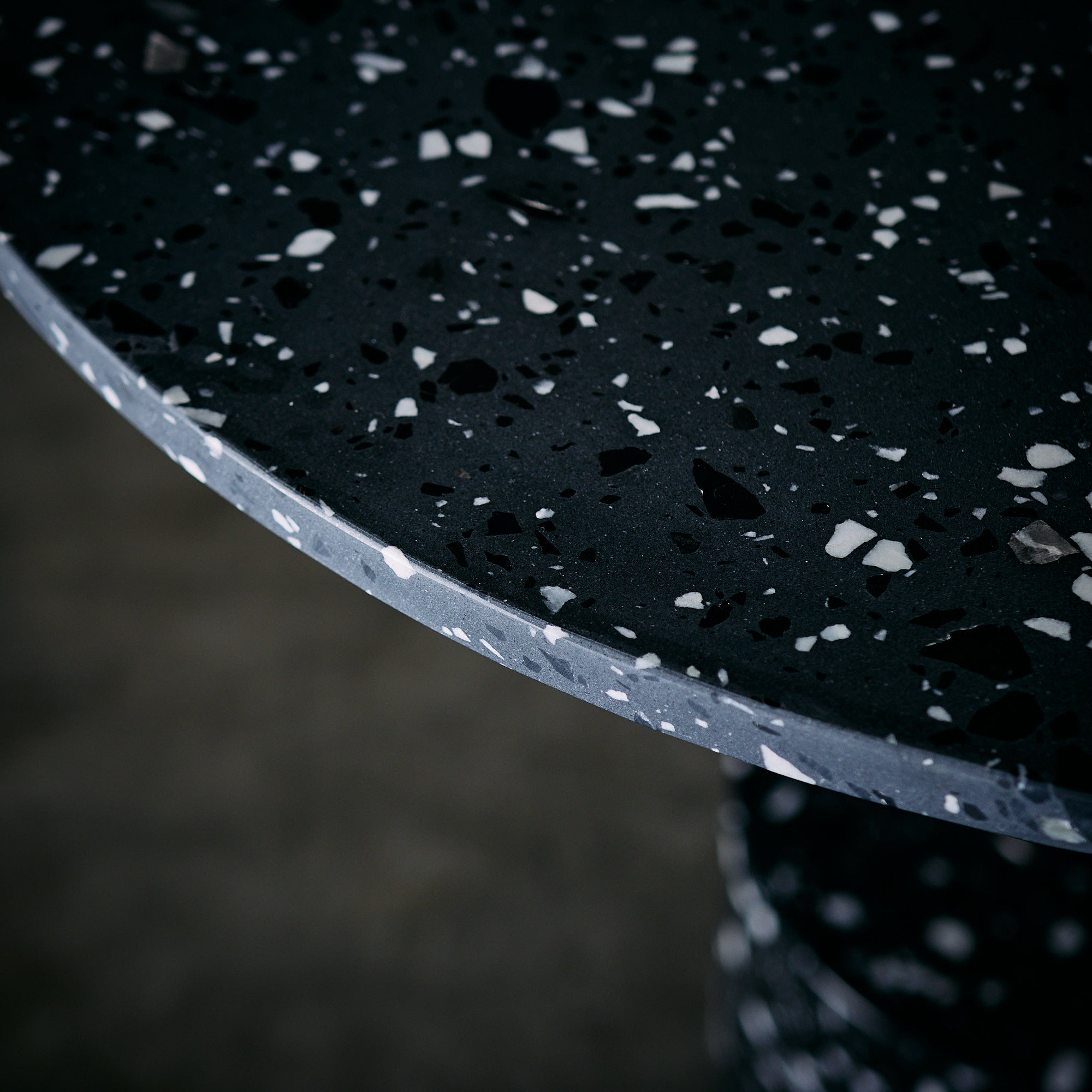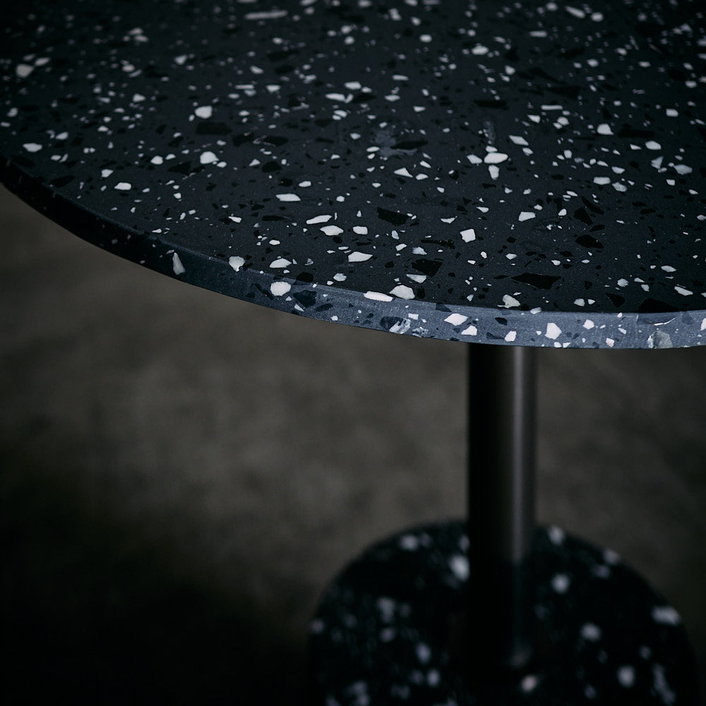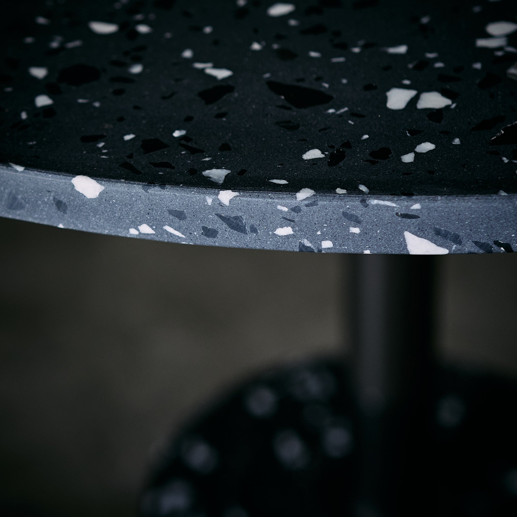 Mesa de Acero inoxidable en terminación bronce con base de terrazo color gris oscuro.