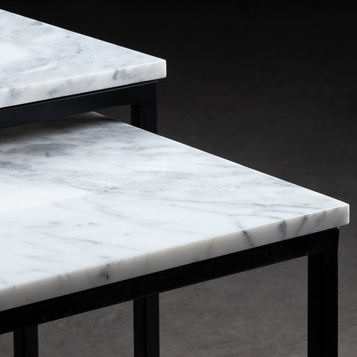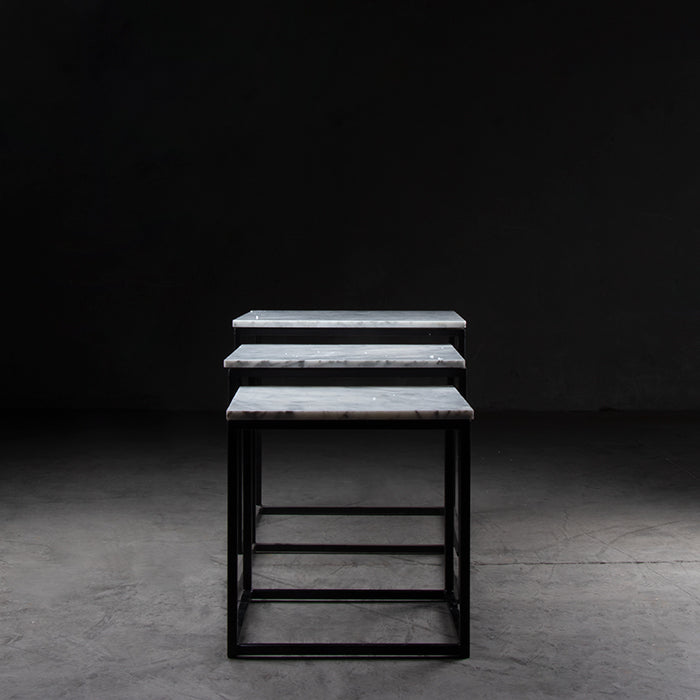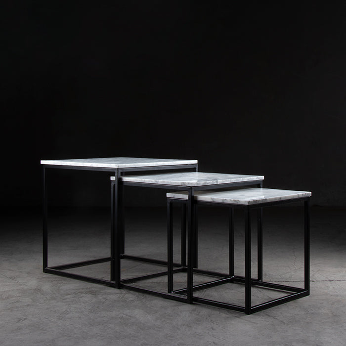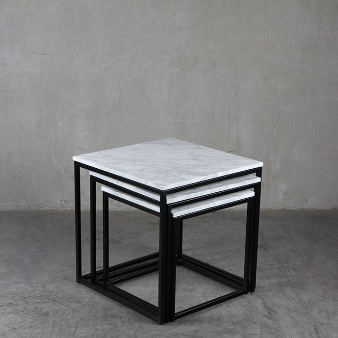 Trio de mesas laterales, cubierta de mármol y base de fierro.