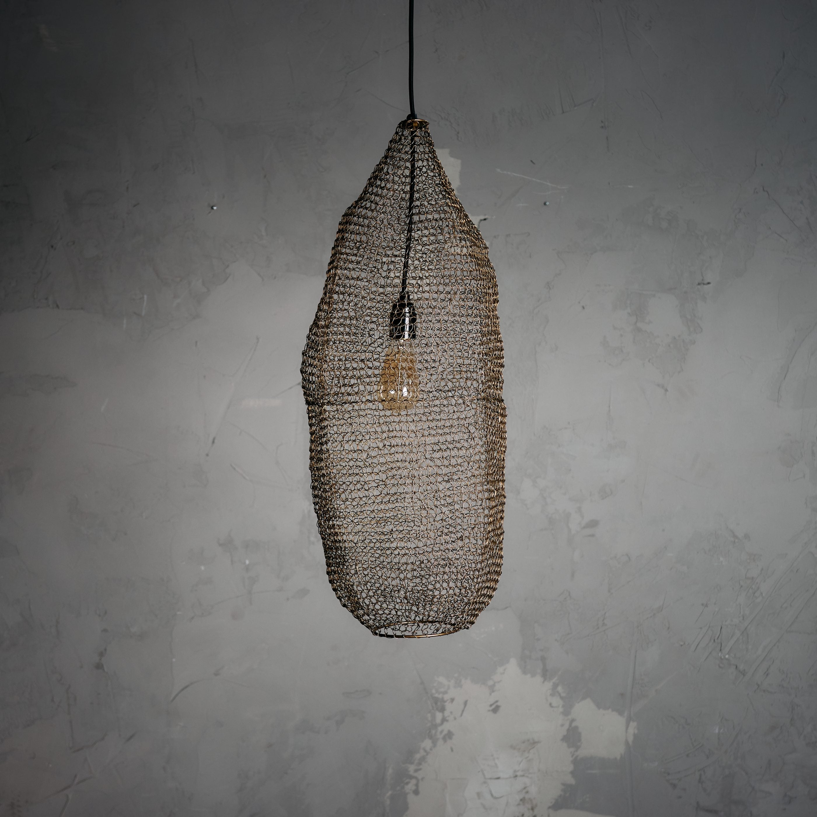 Lampara de colgar tejida en alambre metálico con terminación en tono bronce, formando un entramado orgánico que deja entrever la ampolleta al interior, jugando con la luz y las sombras de forma escultural.