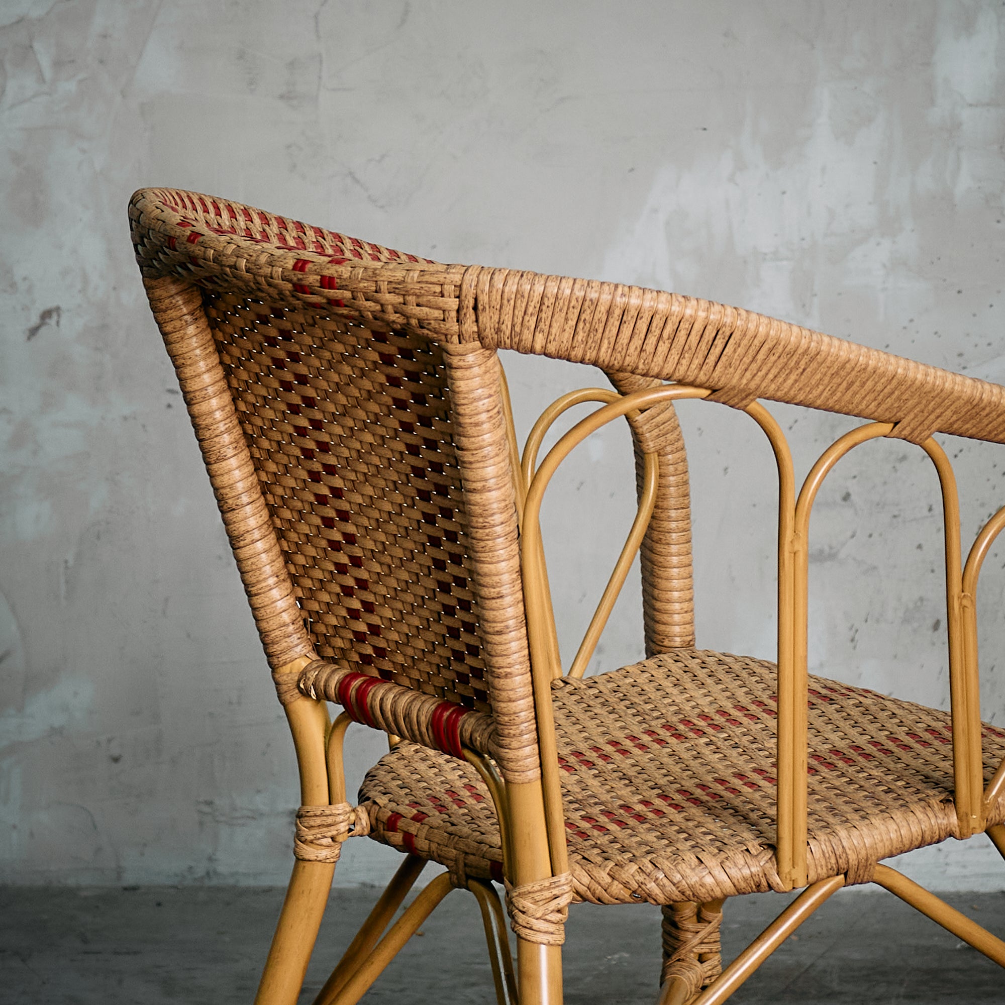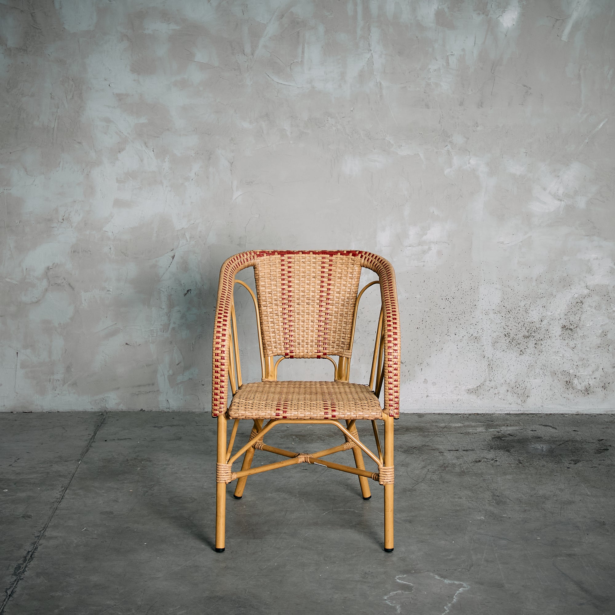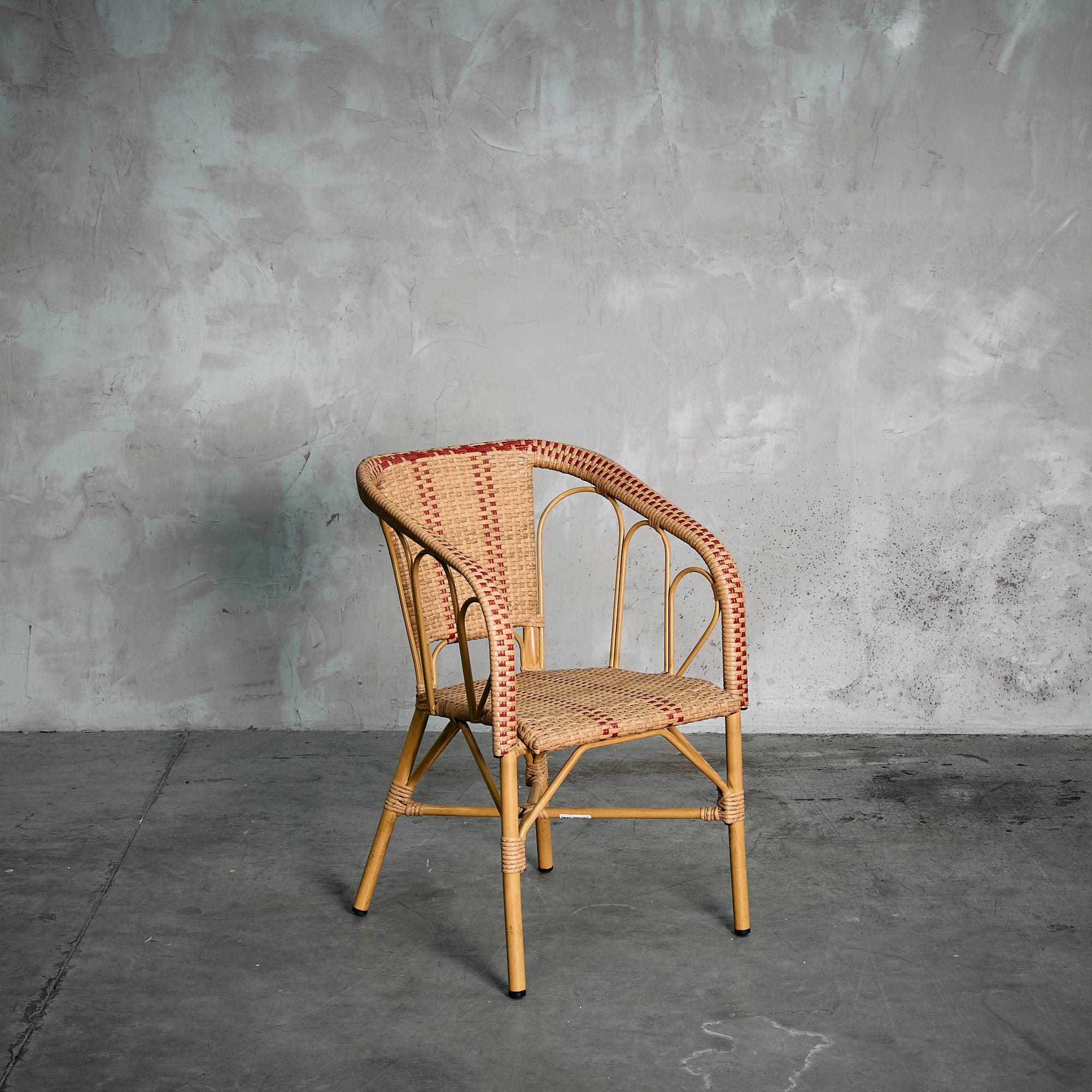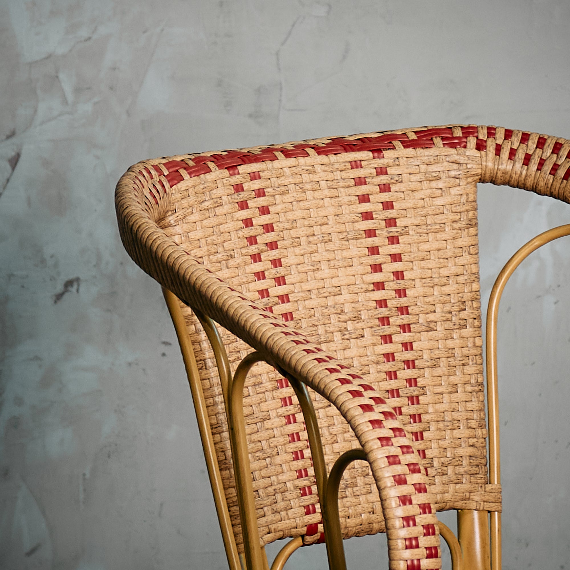 Inspirado en los clásicos cafés de París, este sitial combina el encanto tradicional con materiales contemporáneos que garantizan durabilidad y estilo. Su estructura está fabricada en aluminio pintado con acabado efecto madera, lo que le aporta ligereza y resistencia a la intemperie. El asiento y respaldo están tejidos en ratán sintético, un material versátil y de fácil mantenimiento, ideal para uso en exteriores e interiores.