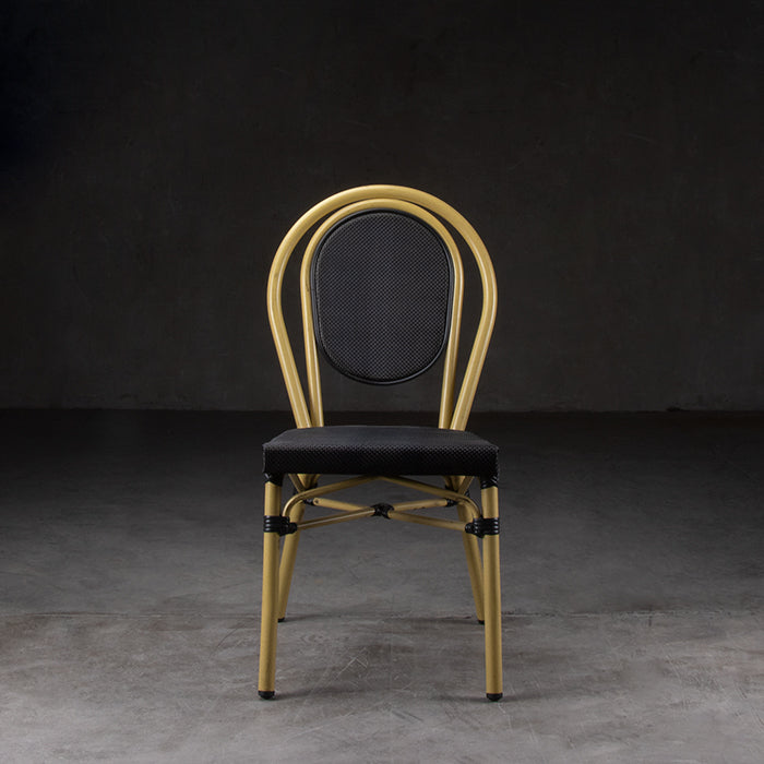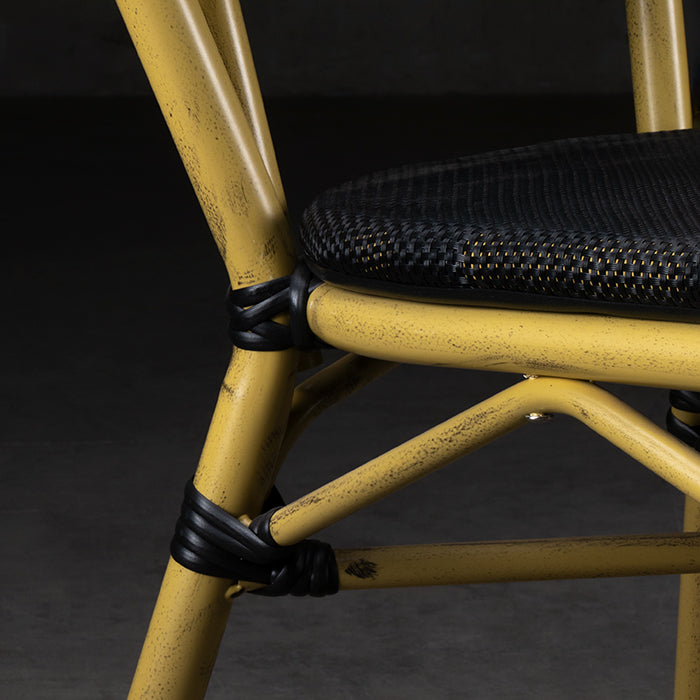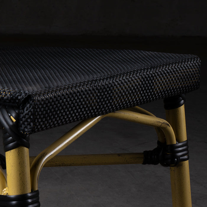 Silla de alto tráfico con estructura de aluminio y tejido de fibra sintética, siendo ideal para lugares expuestos al agua y sol