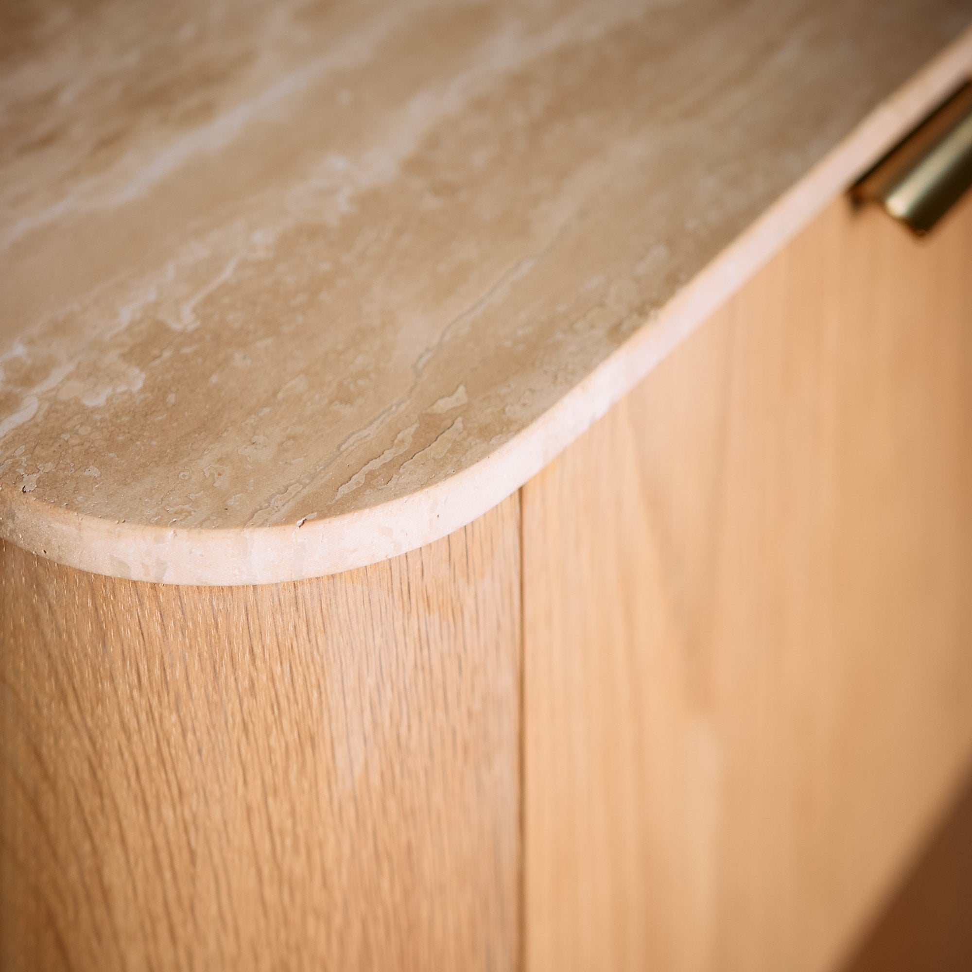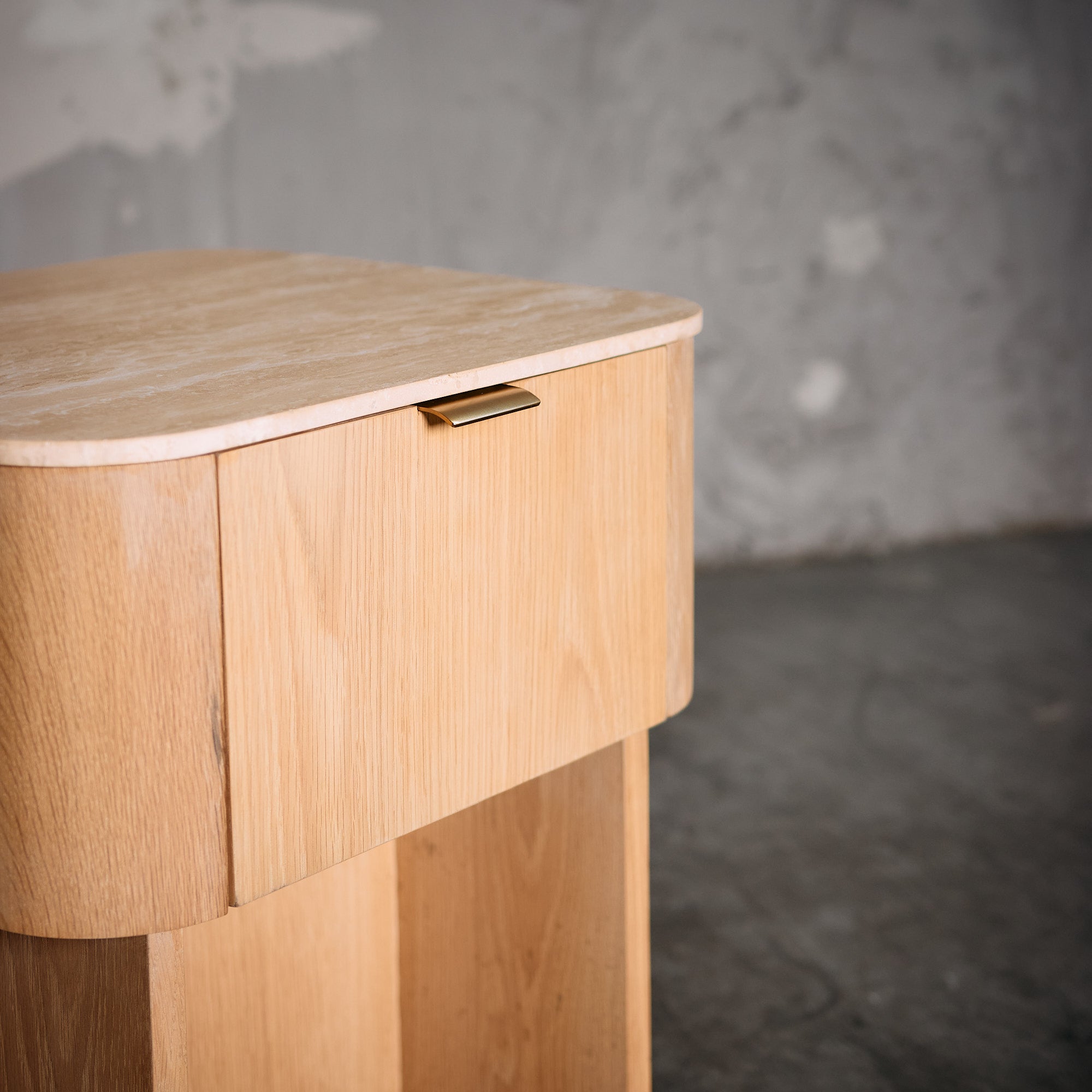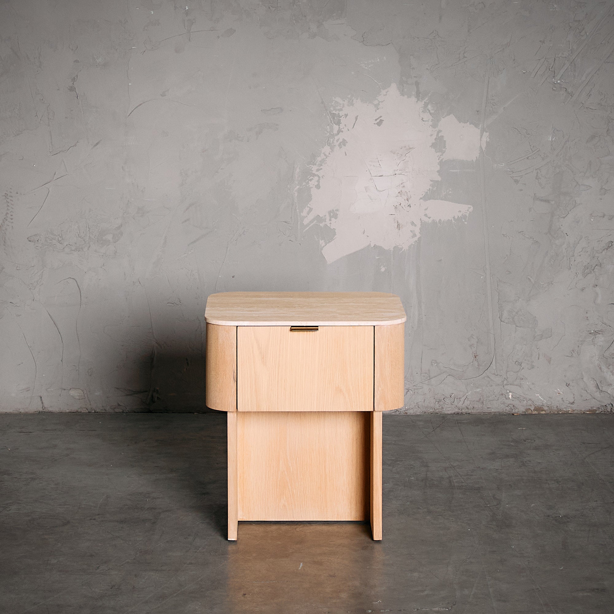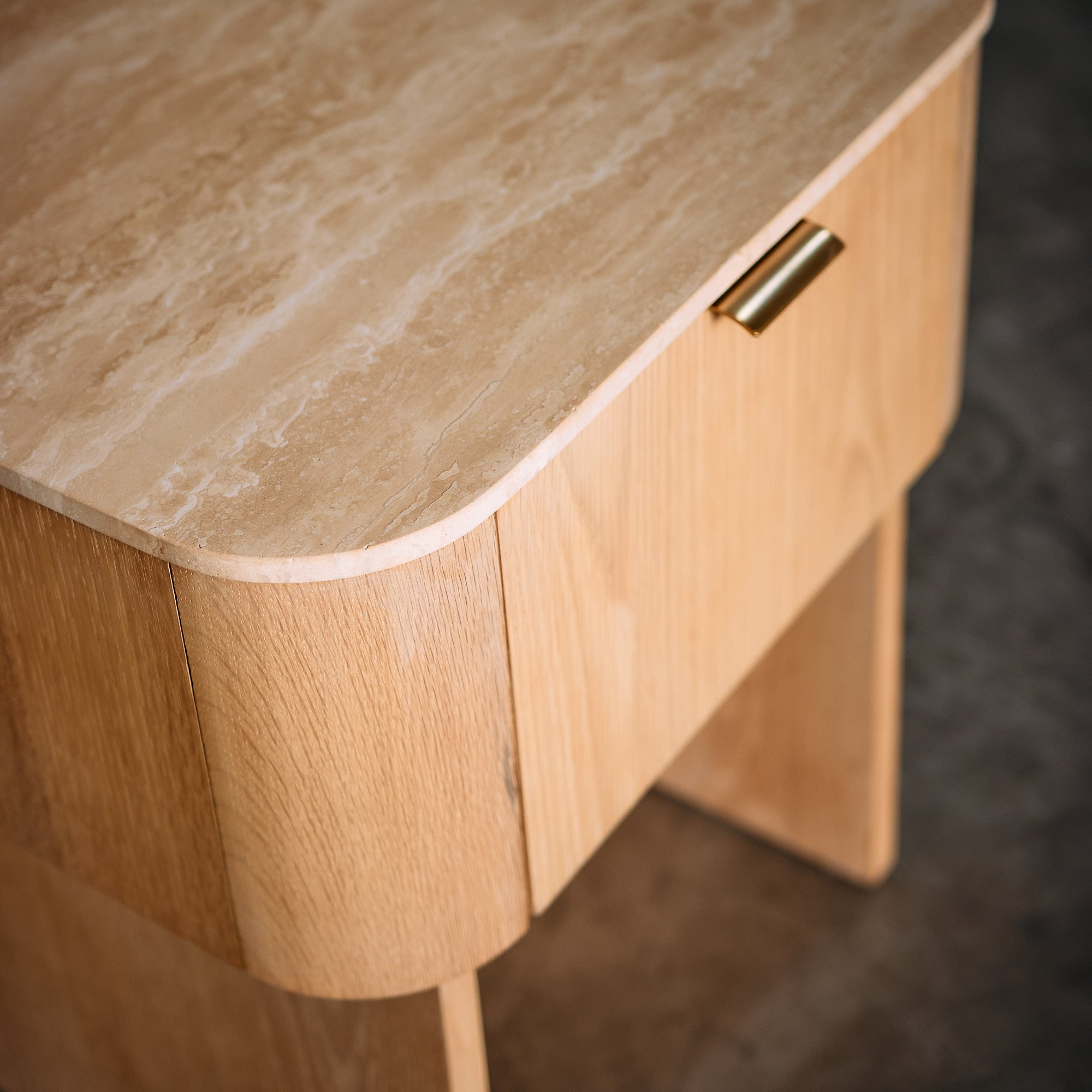Velador fabricado en Madera de Roble con terminación natural resaltando la belleza de las vetas y la textura de la madera, mientras que su cubierta de Mármol Travertino añade un toque de sofisticación atemporal. Su diseño moderno y funcional la convierte en la pieza ideal para complementar tu dormitorio con estilo y practicidad.