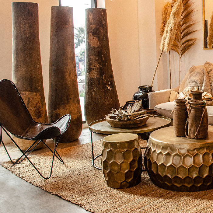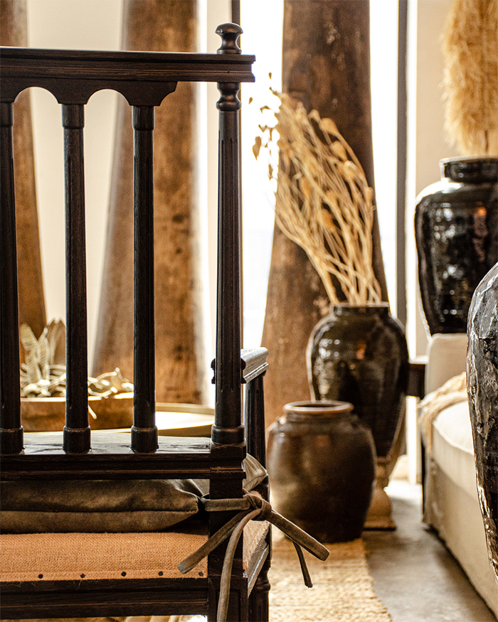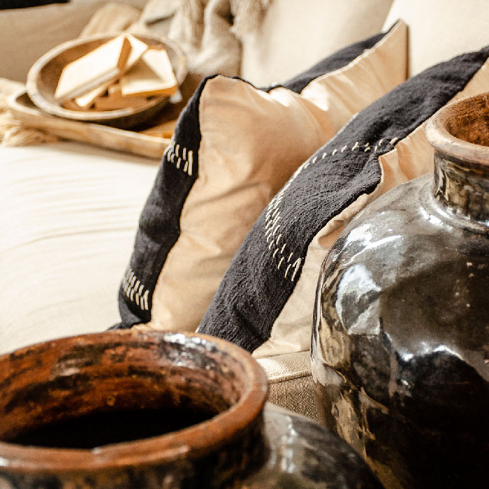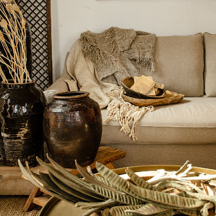 Elementos imperfectos de origen natural como los jarrones, las fibras, maderas y linos son fabricados a mano por artesanos, cada uno dueño de un oficio y una técnica la cual les da vida.