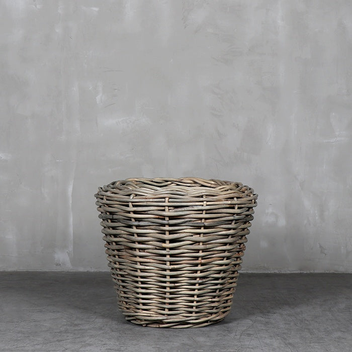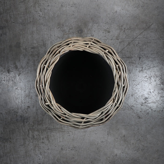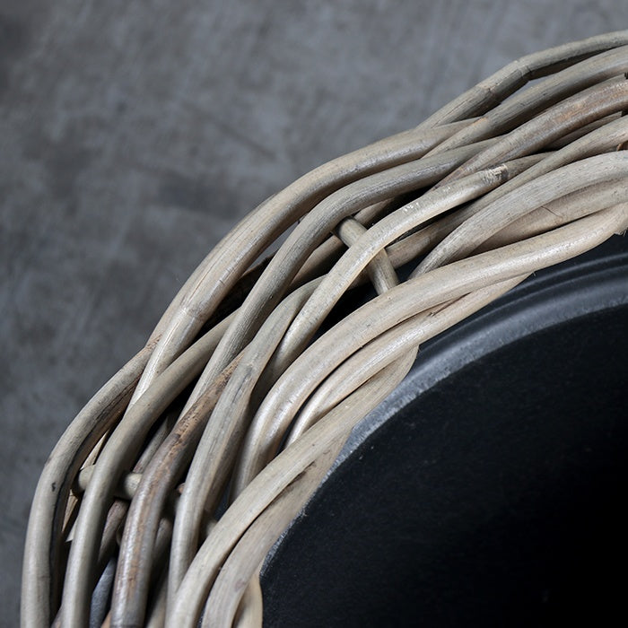 Macetero de ratán natural con terminación gris acuosa. Para mejor soporte de las plantas lleva en el interior un macetero plástico