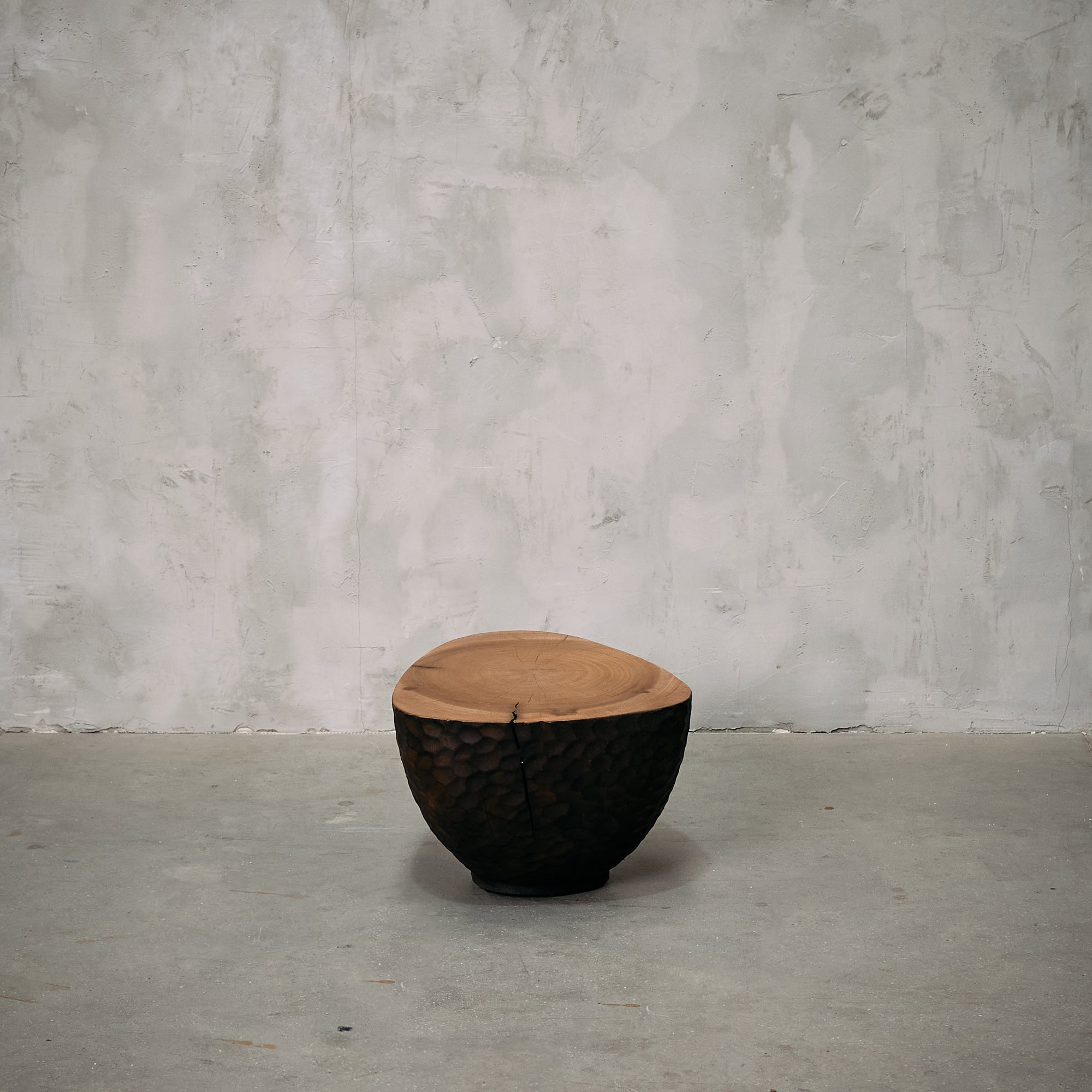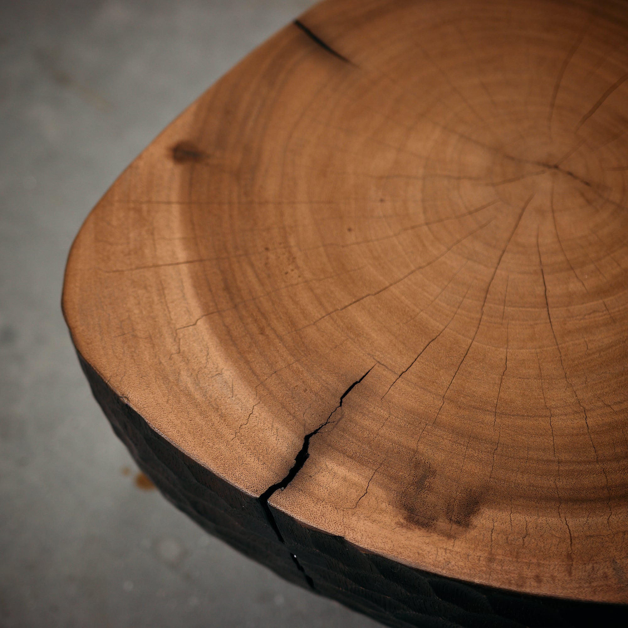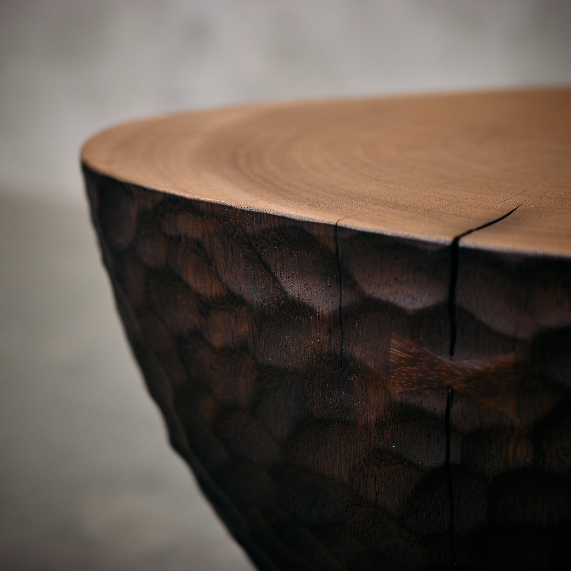 La cubierta superior presenta un acabado liso que destaca las vetas naturales de la madera, mientras que la base exhibe un tallado artesanal con textura irregular y acabado oscuro, generando un atractivo contraste visual.