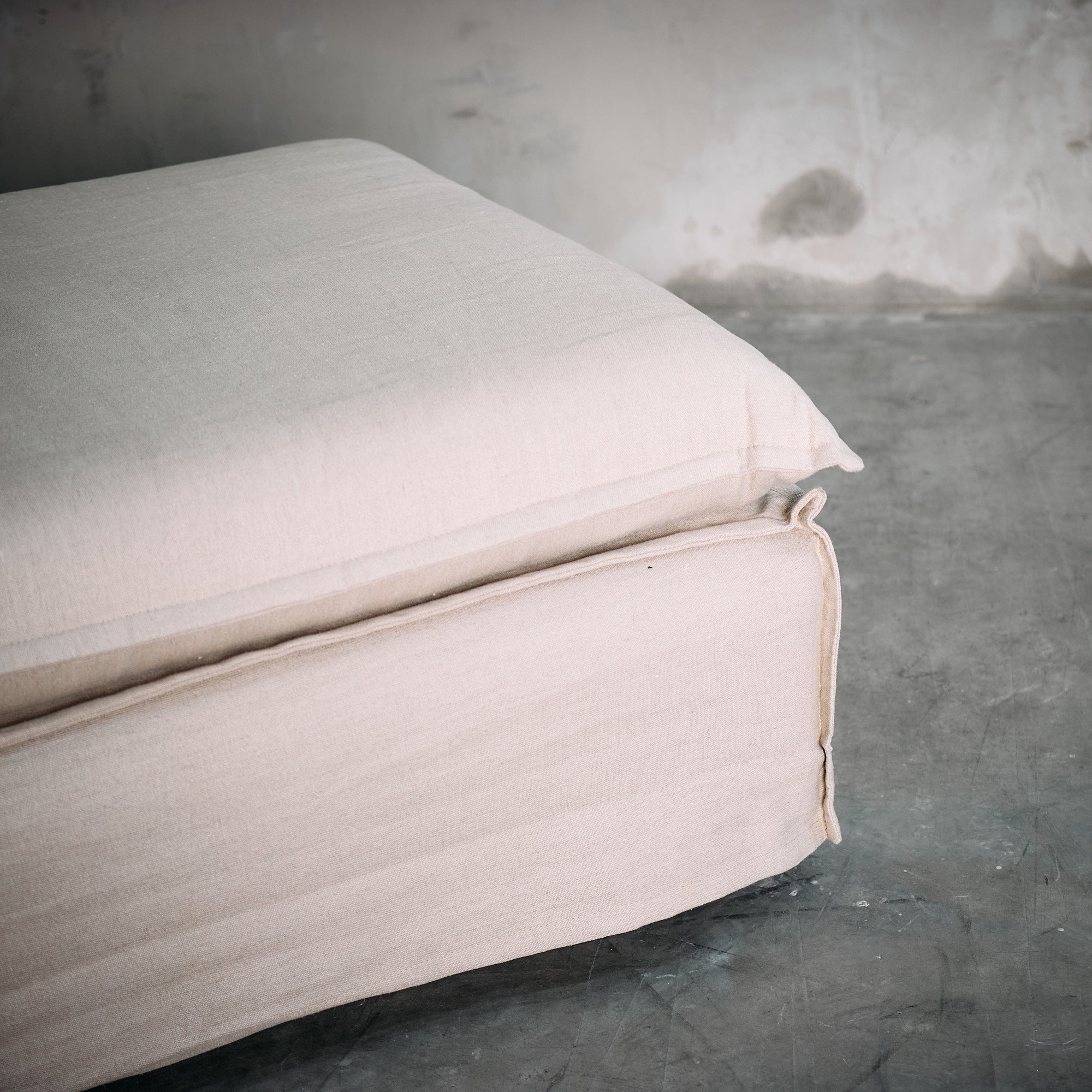 Pouf Carmen, uno de nuestros diseños de fabricación nacional en el que el lino resalta por su calidez al tacto y resistencia.