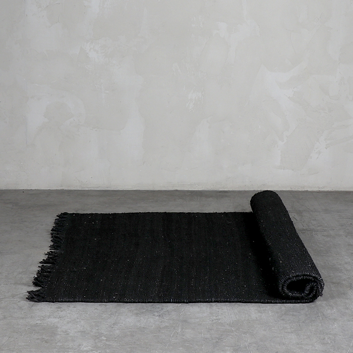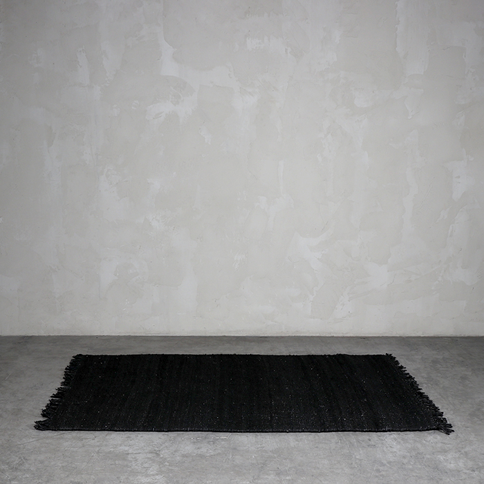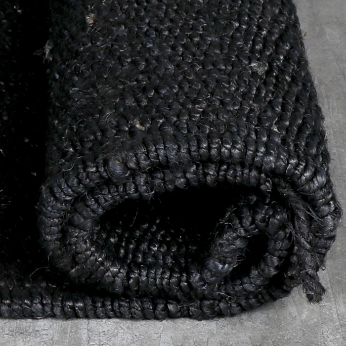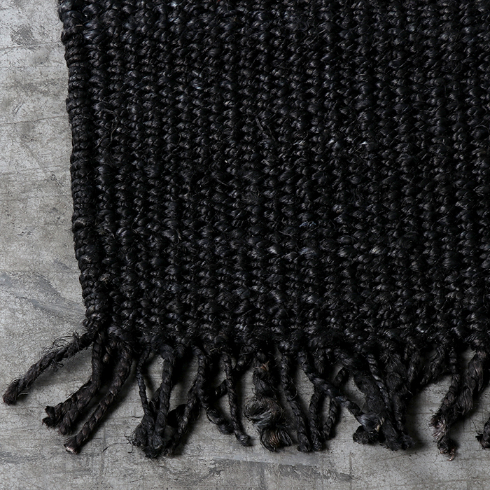 Tejido de yute teñido negro. (nombre original de este tejido es: Dhurrie Weave, hechas en India) con flequillo en los extremos.