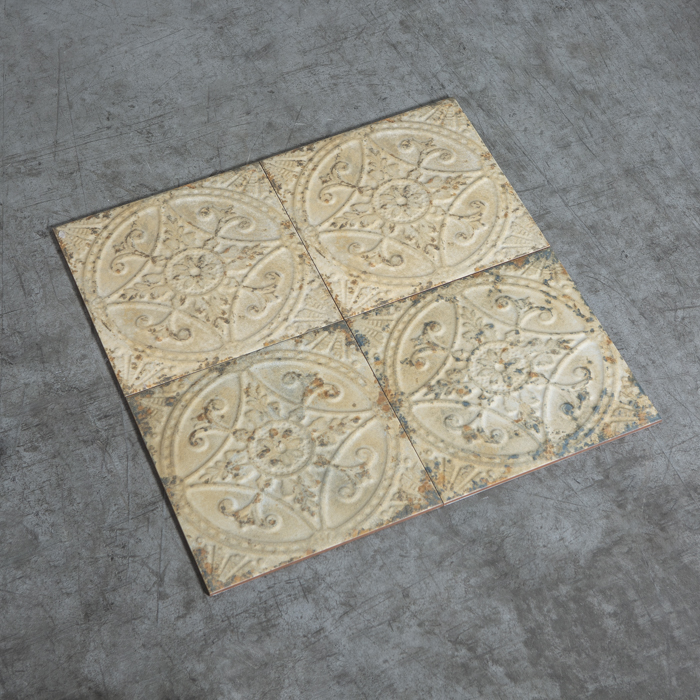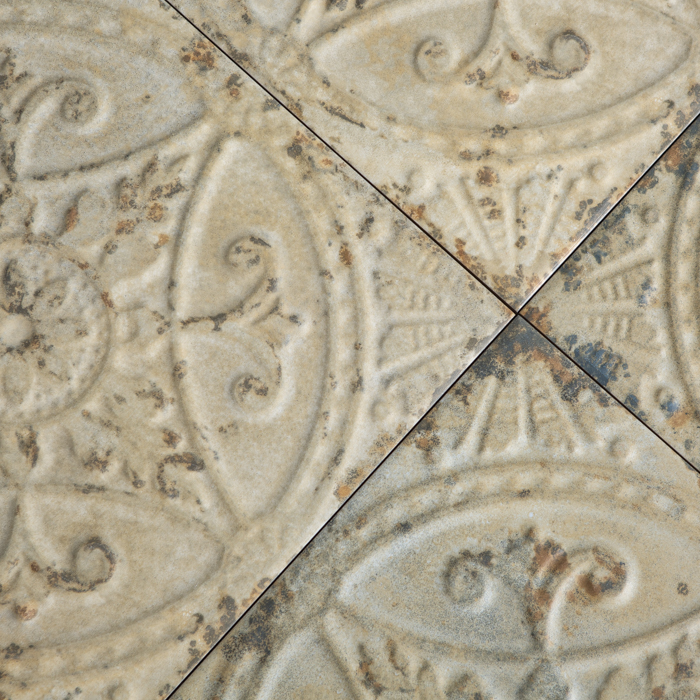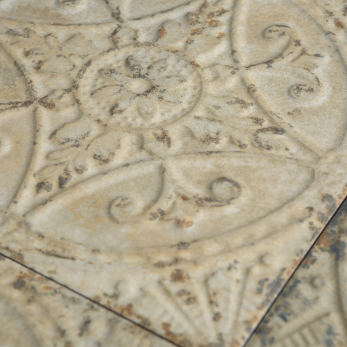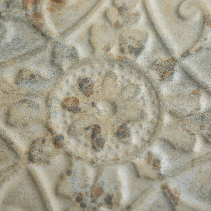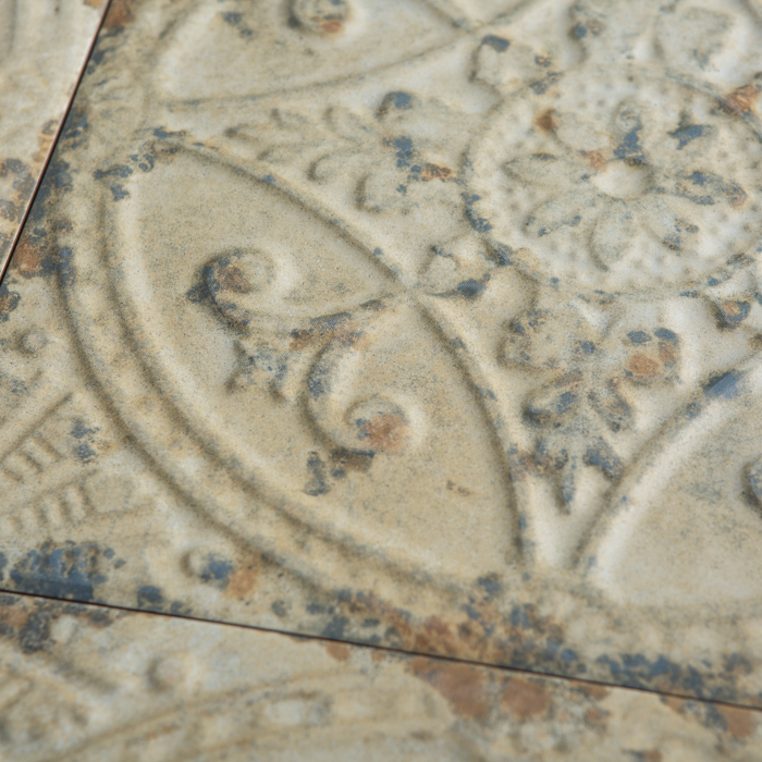 Baldosa con relieve especial como revestimiento de pared, evoca a las antiguas chapas metálicas que se aplicaban tanto en frisos como techos antiguamente. Fabricada con tecnología Layer Tech, lo último en impresión de azulejos. Con acabados espectaculares en pavimento de gres. Esta innovadora tecnología crea diferentes texturas en cada superficie combinando materiales, colores y formas.