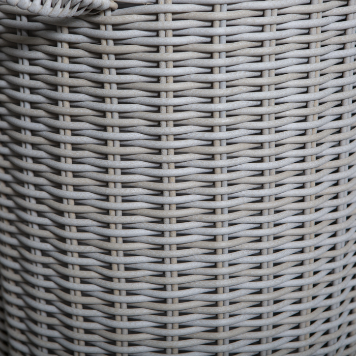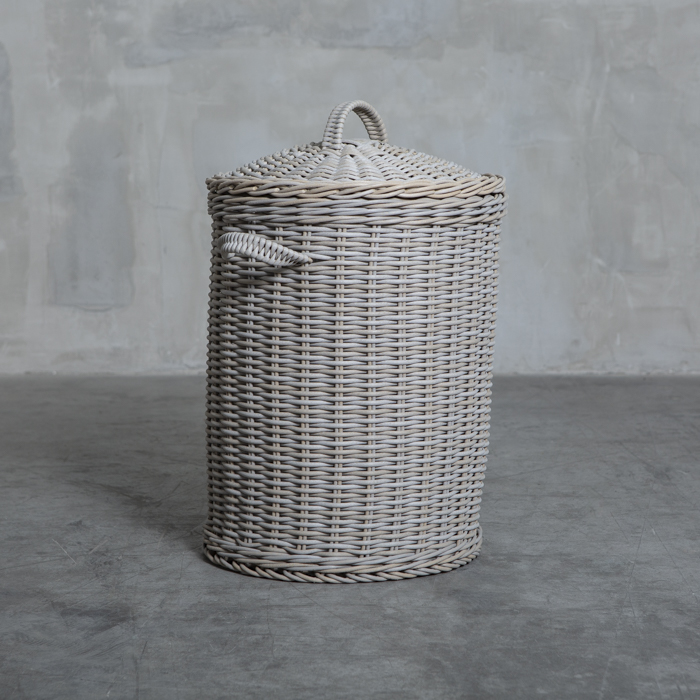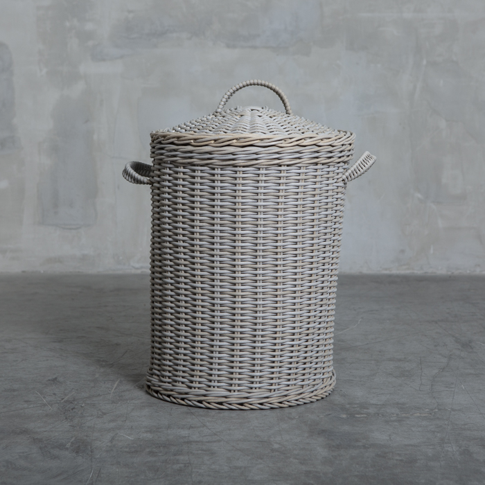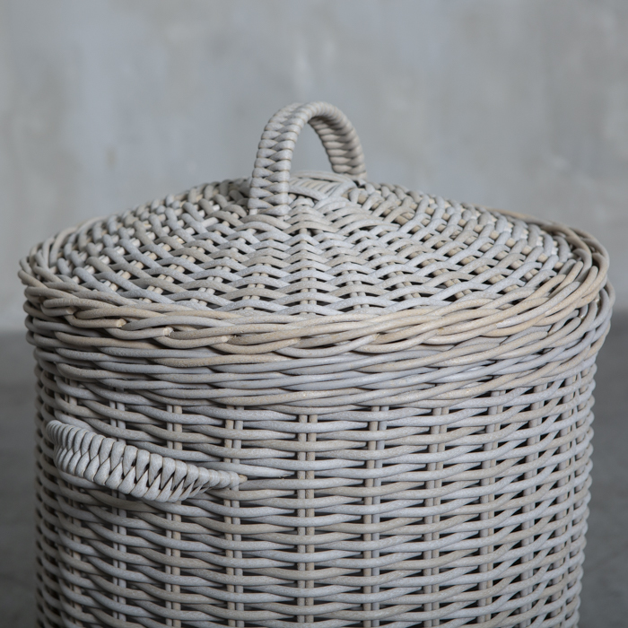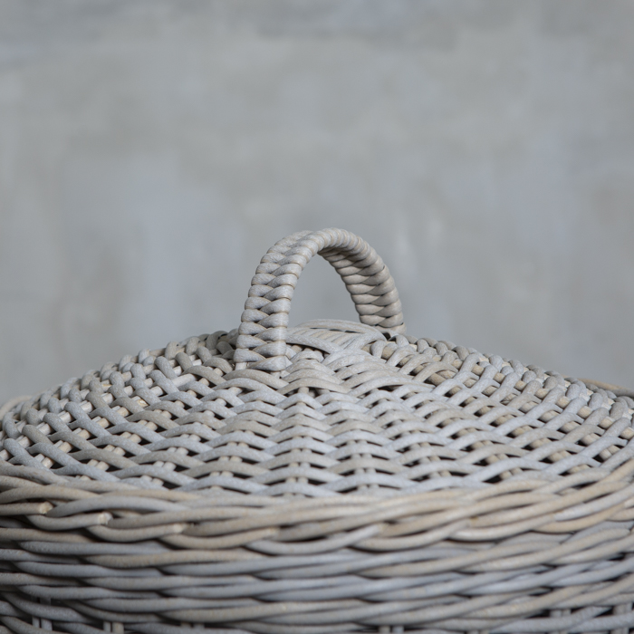 Canasto con tapa tejido en ratán sintético redondo de 6 mm con acabado en color bosque gris. Destaca por su gran variedad de funciones.
