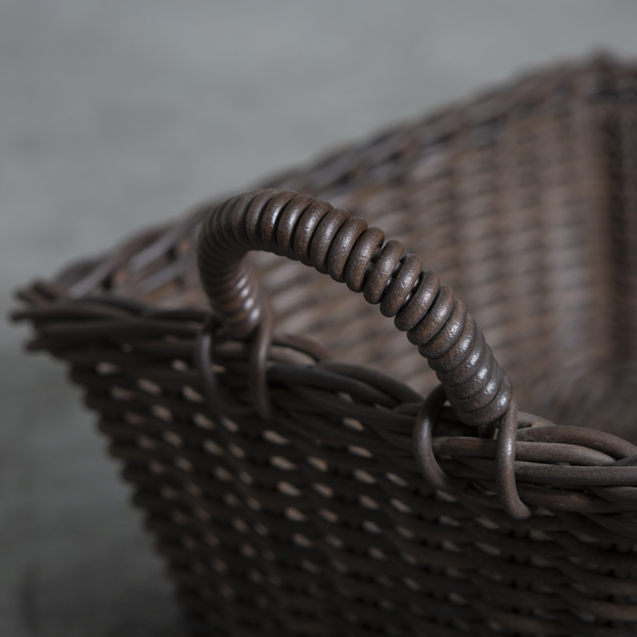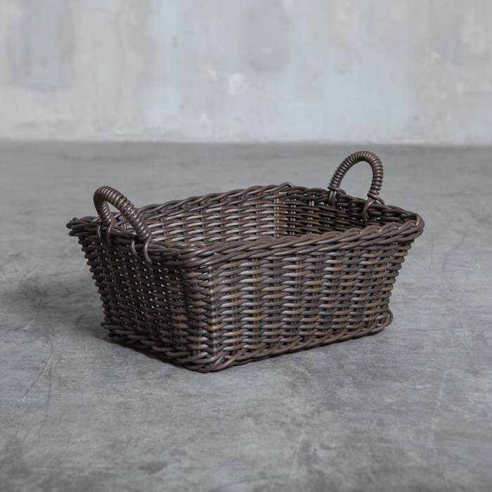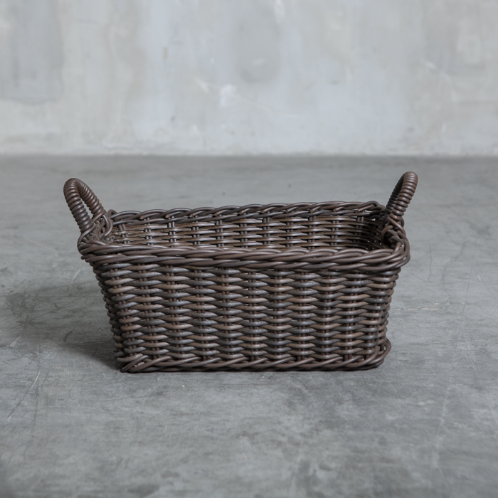 Canasto totalmente tejido en medio núcleo sintético de ratán 6 mm con un acabado color bosque gris.