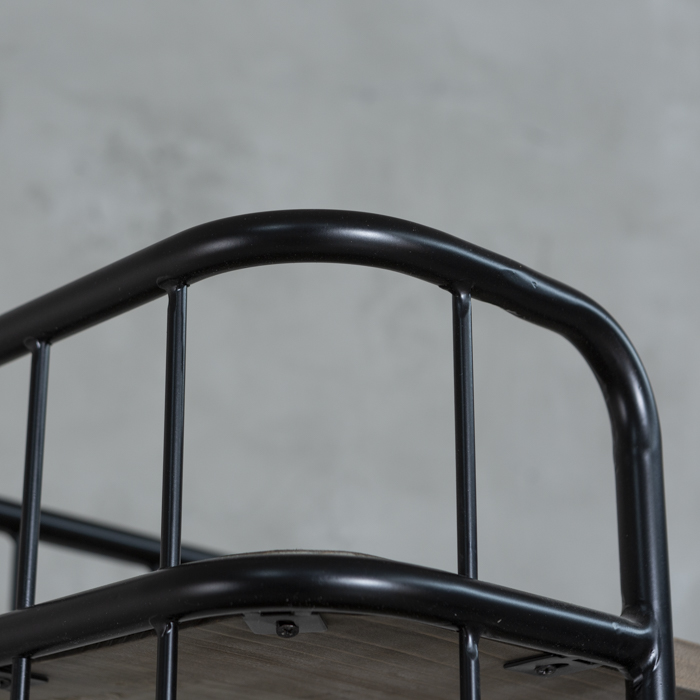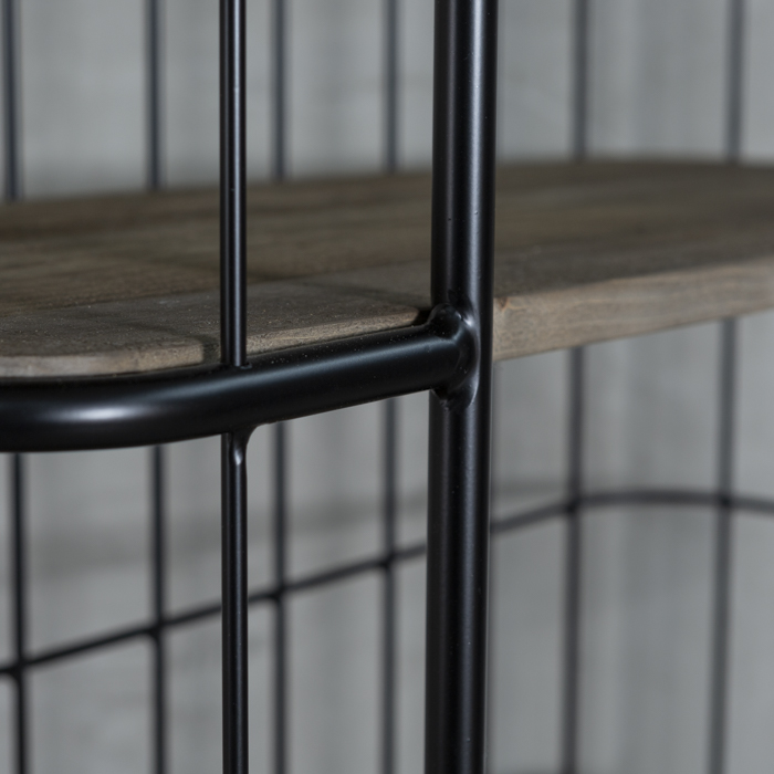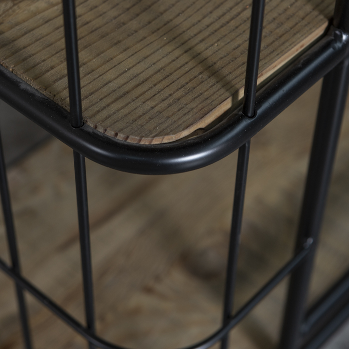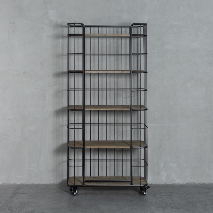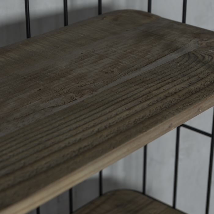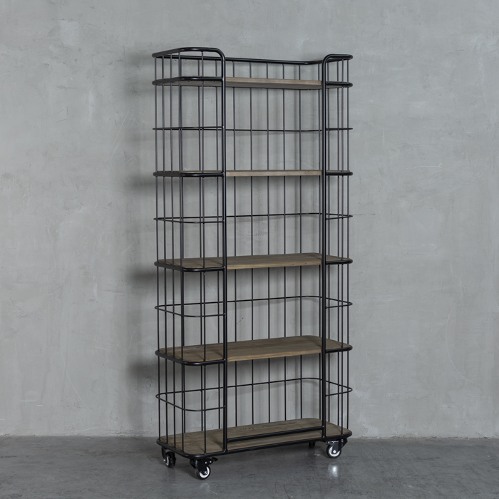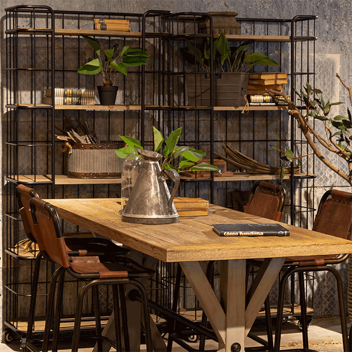 Estantería estilo industrial, con estructura metálica y bandejas en madera.