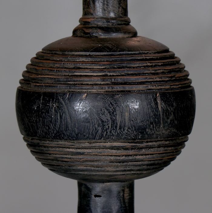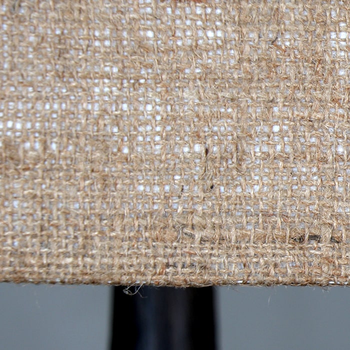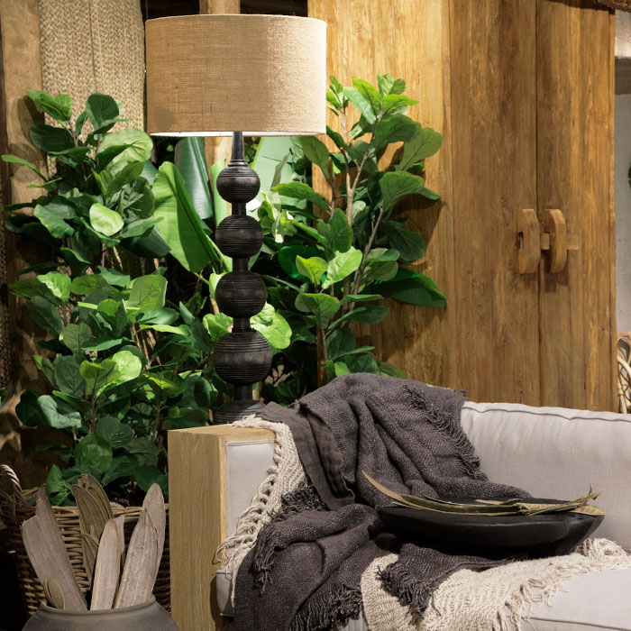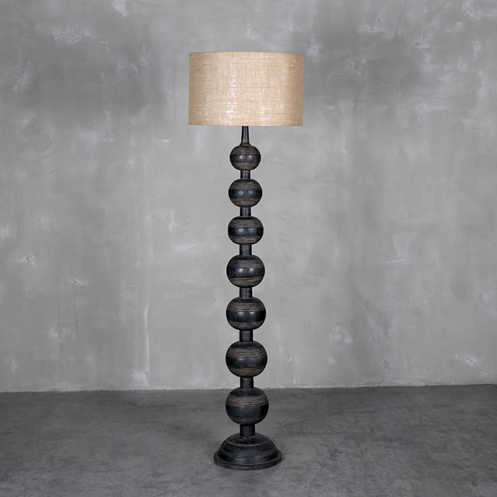 Lámpara de pie con estructura de madera pintada y pantalla natural.