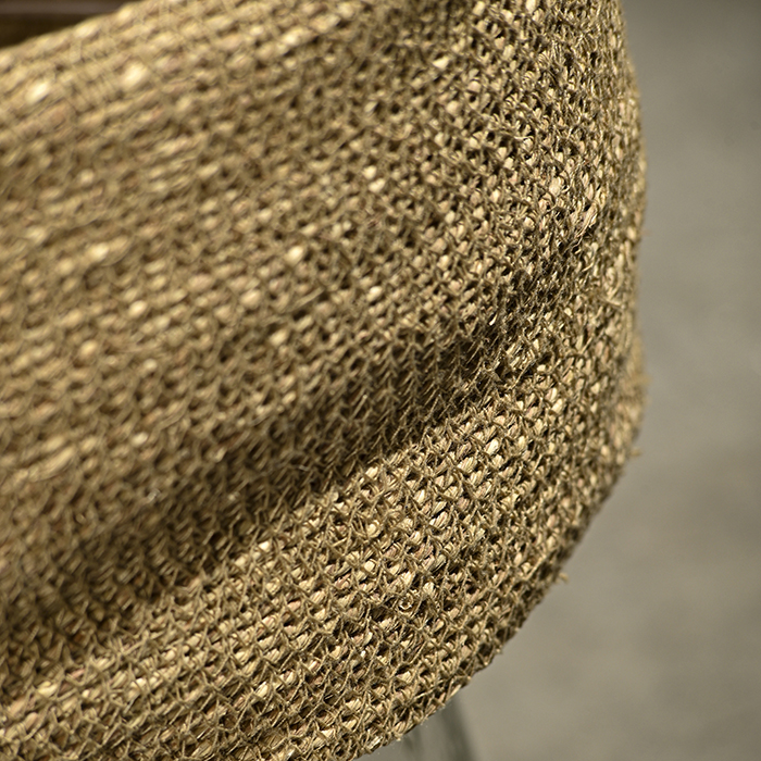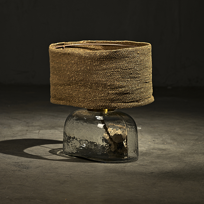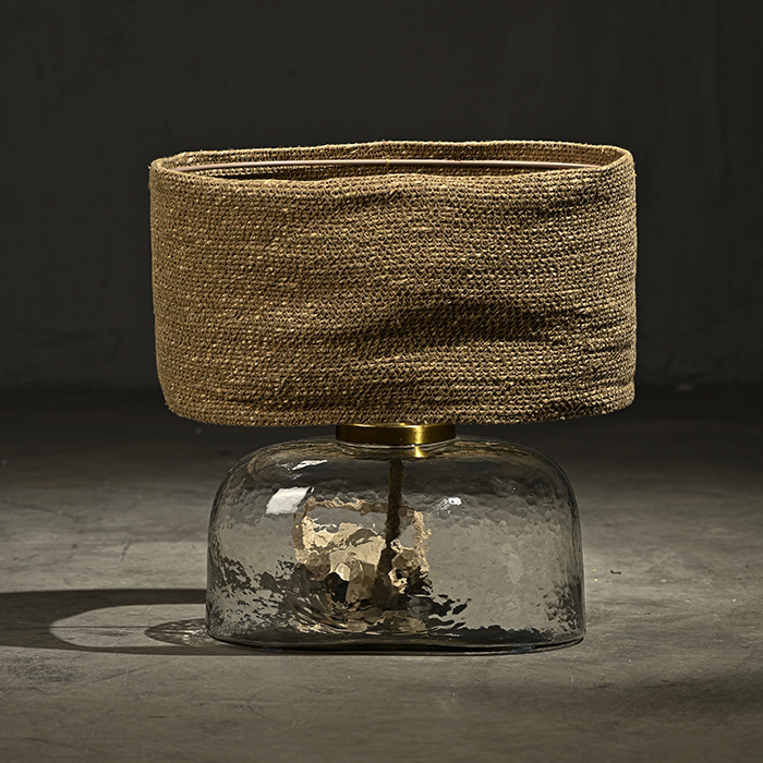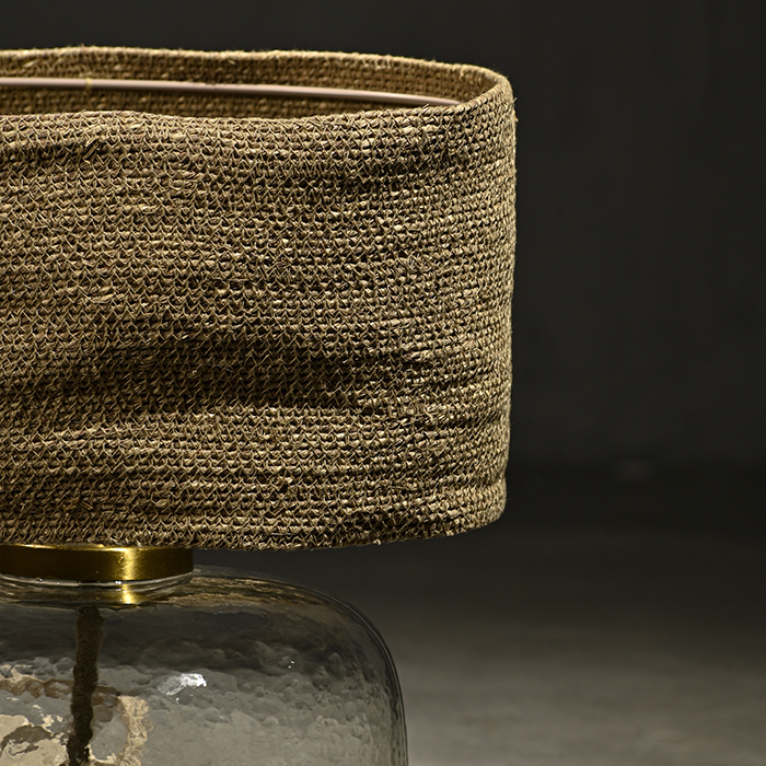 Lámpara de mesa con base de vidrio soplado y pantalla de yute tejido natural.
