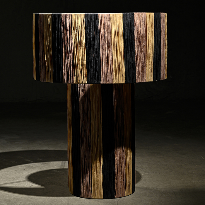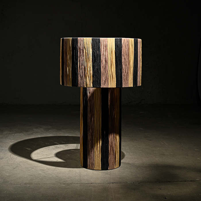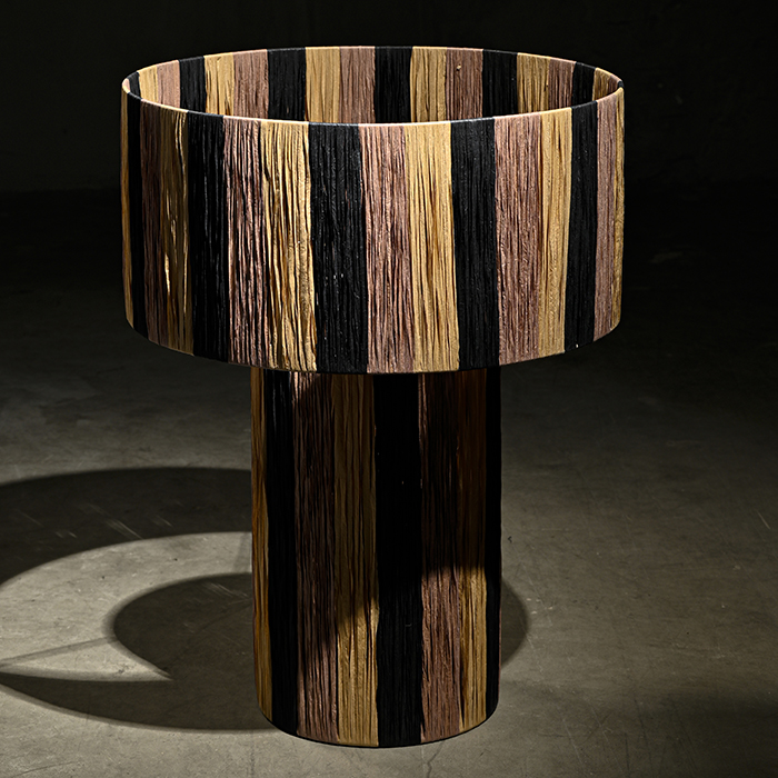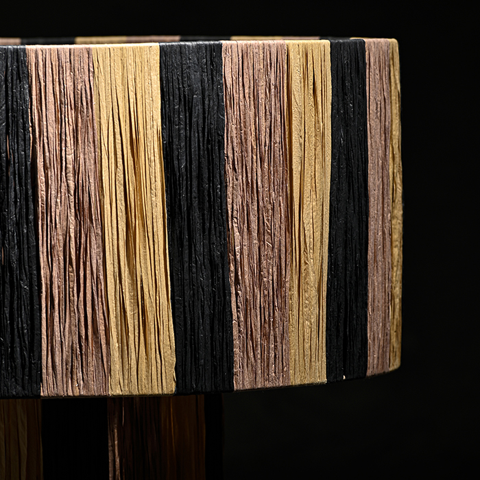 Lámpara de mesa con estructura de alambre, tejida en rafia color negro, café y natural.
