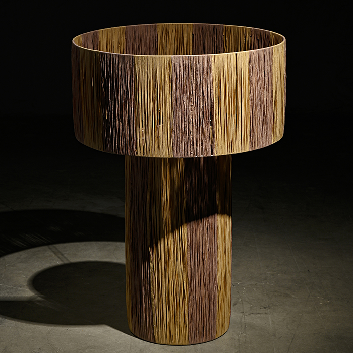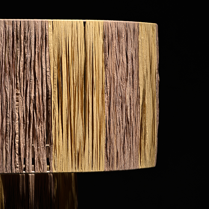 Lámpara de mesa con estructura de alambre, tejida en rafia color café y natural.