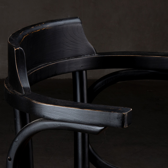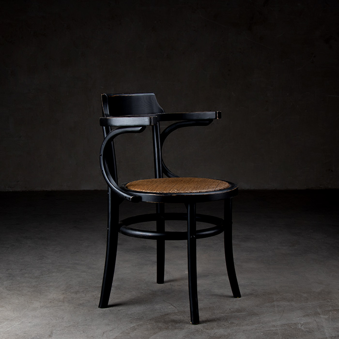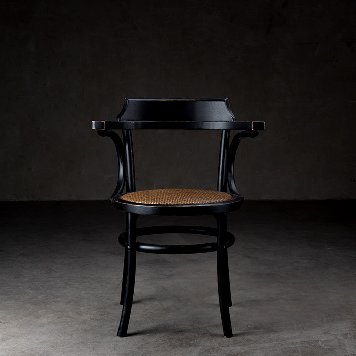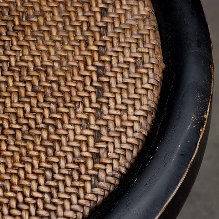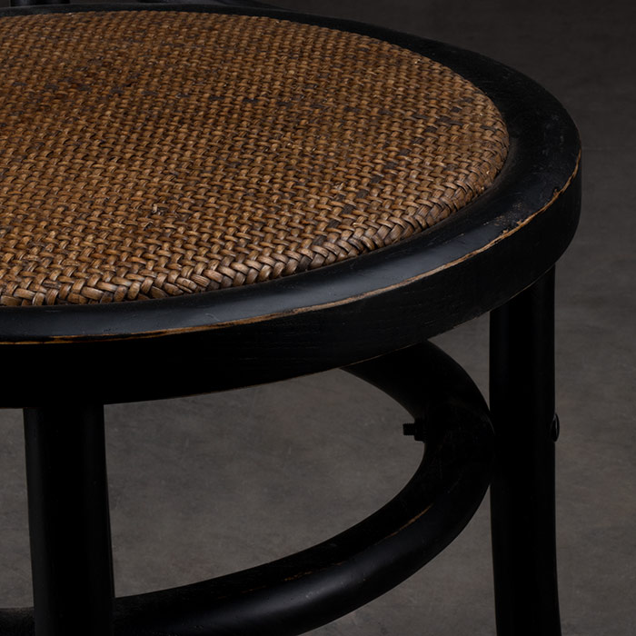 Silla de roble antiguo en terminación negra antiguo. Enjuncado de ratán.