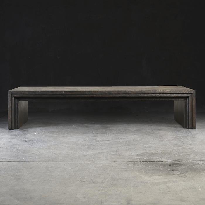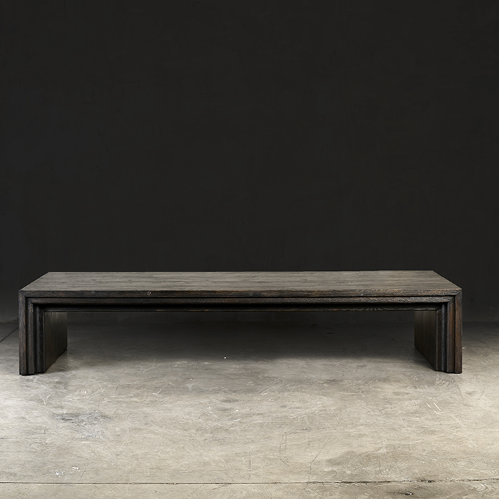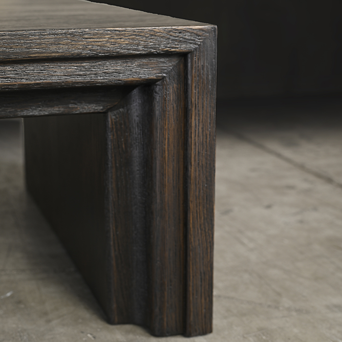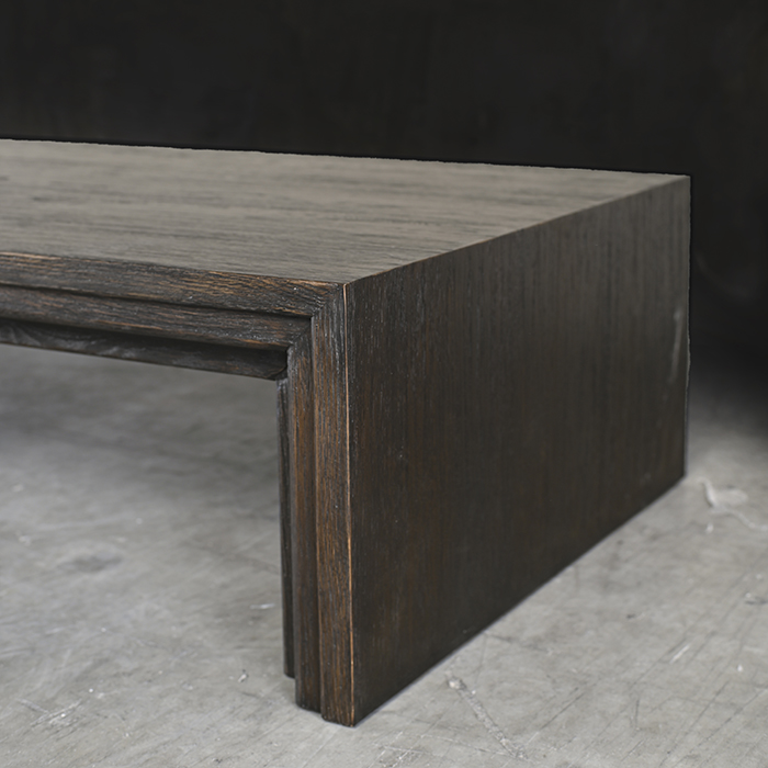 Mesa de centro estructurada en roble rojo y enchapada en roble en terminación nogal.