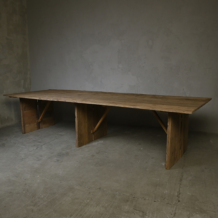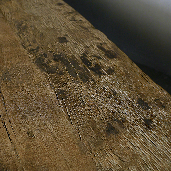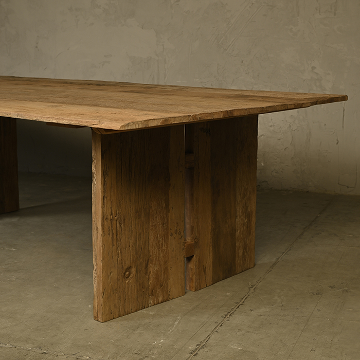 Materialidad: Mesa de comedor de maderas recuperadas de suelos antiguos de la India.