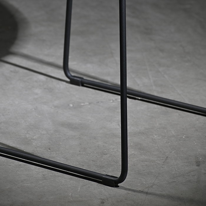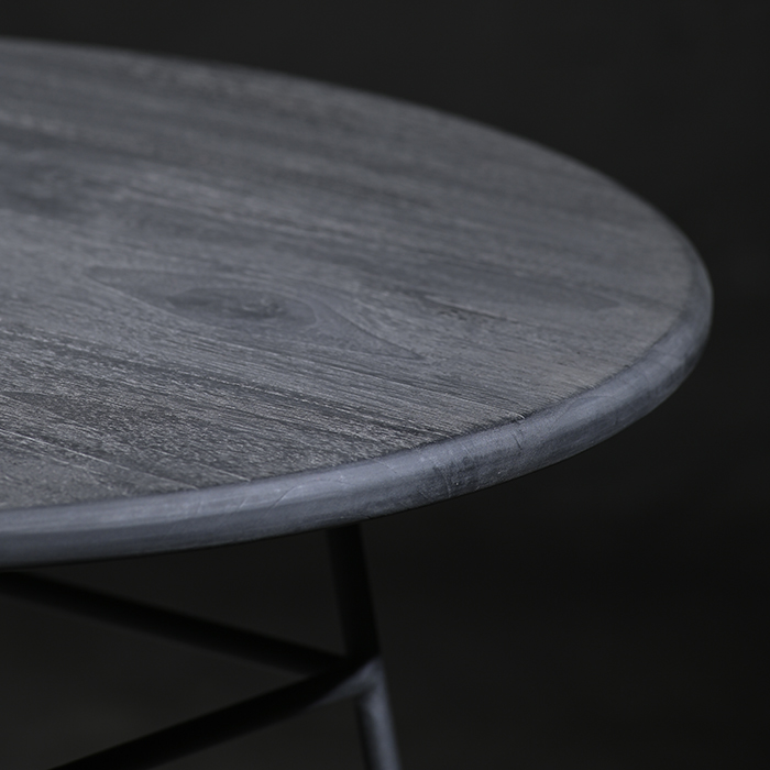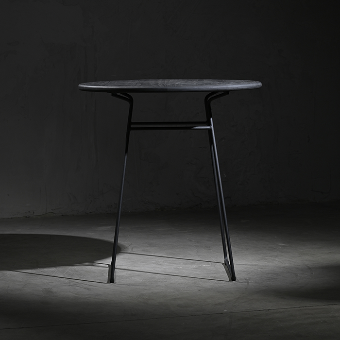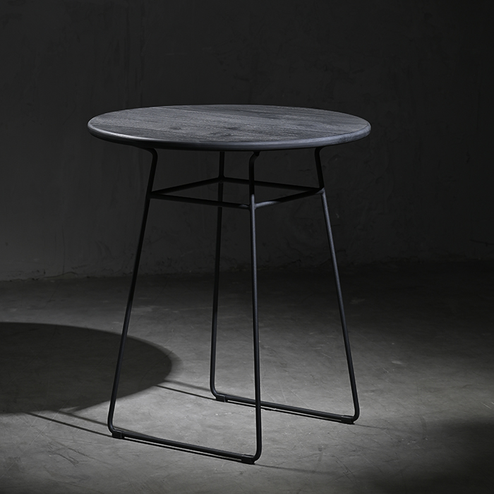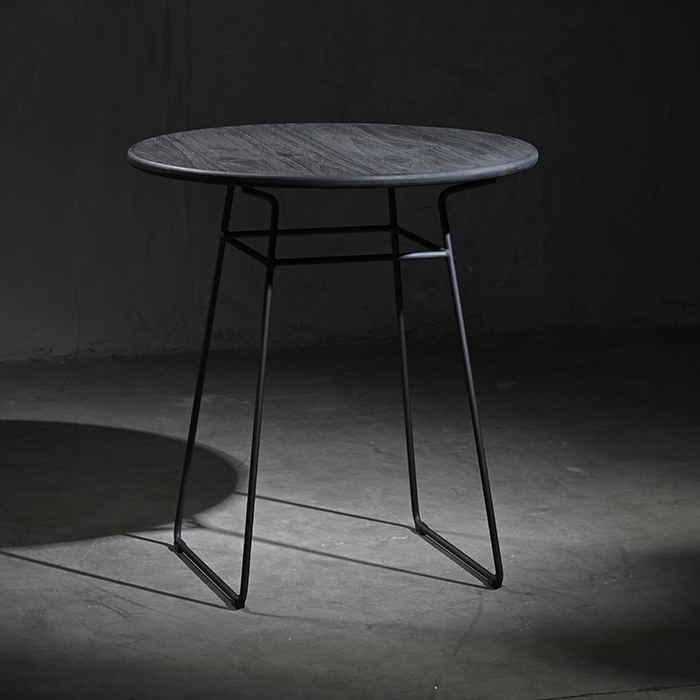 Mesa con cubierta en madera de teca con terminación color carbón y estructura de fierro electropintado color gris oscuro.