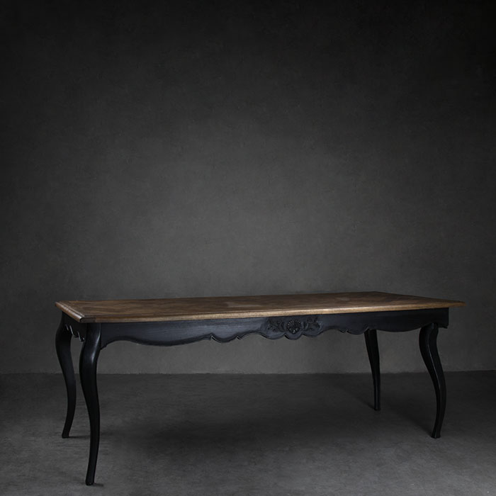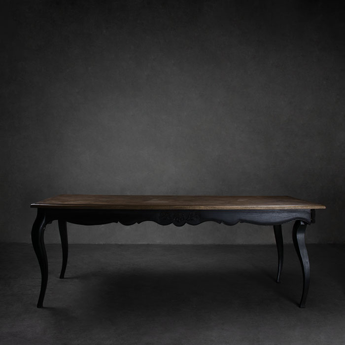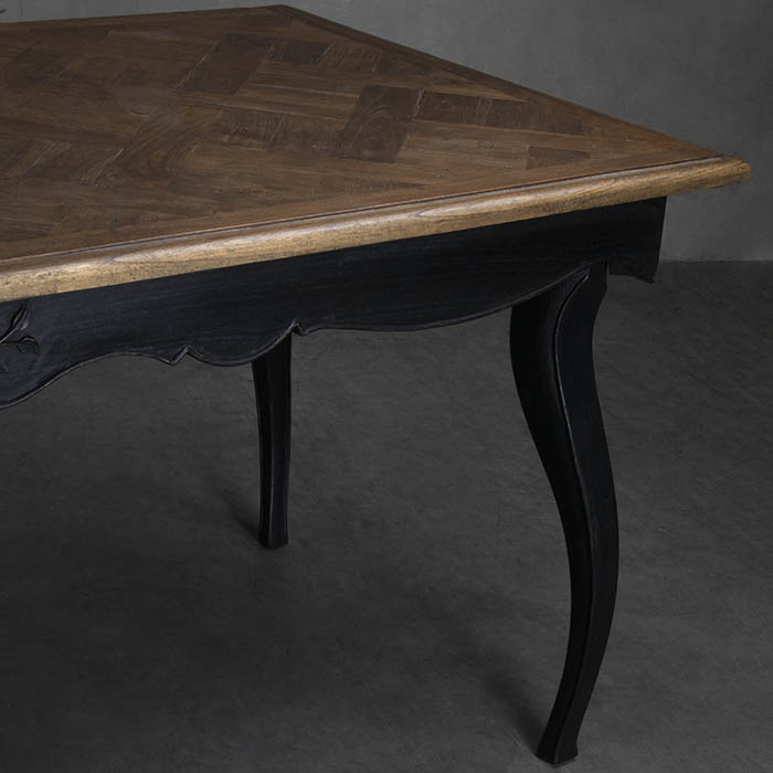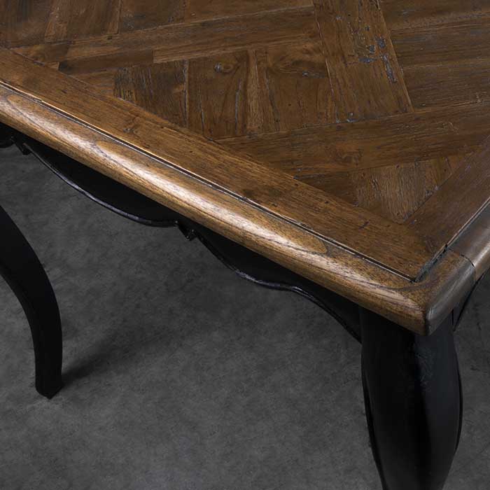 Mesa con patas de madera de mindi con terminación negra y cubierta de madera de teca