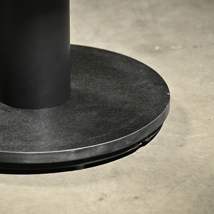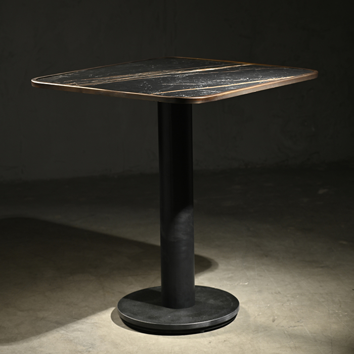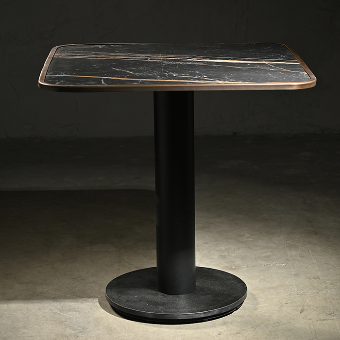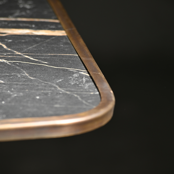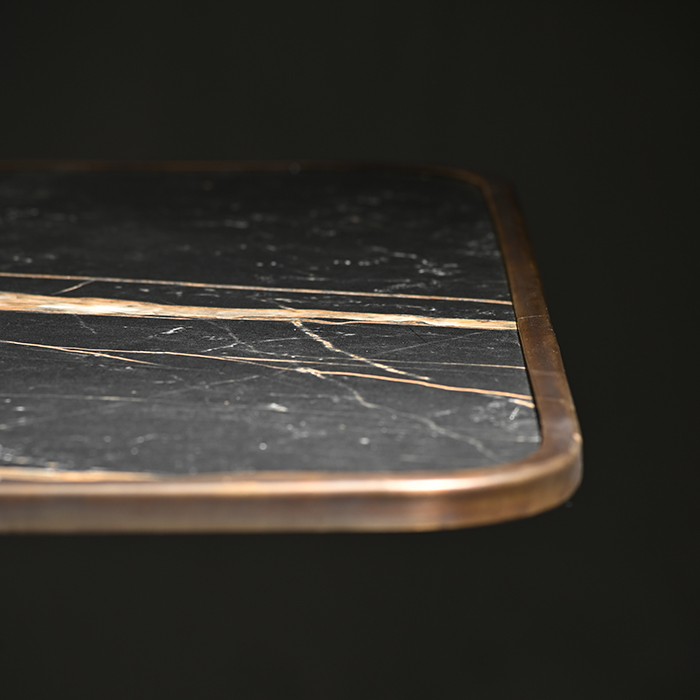 Mesa con cubierta enchapada en piedra y anillo de fierro en terminación bronce envejecido. La base es de fierro con mármol.