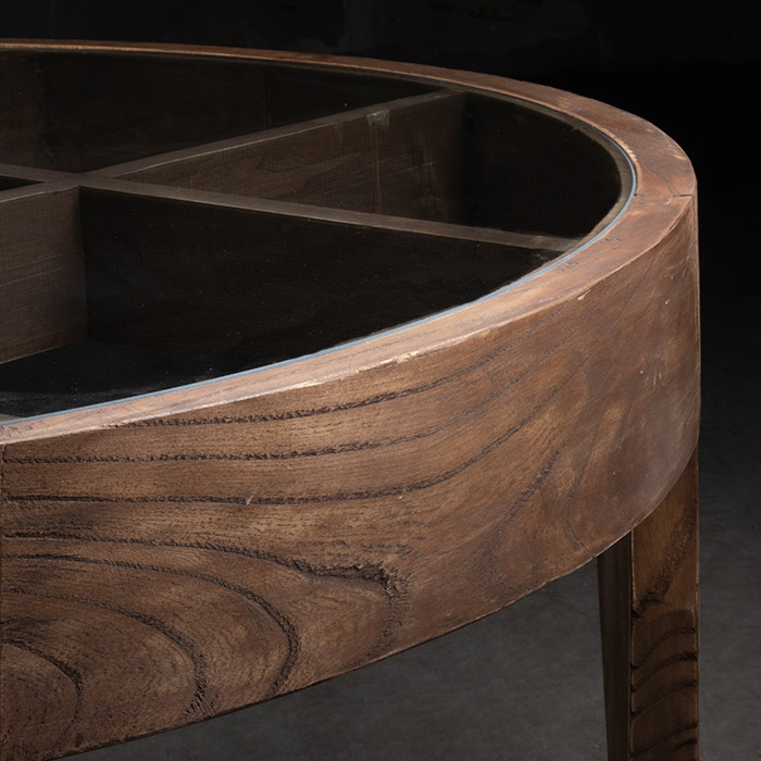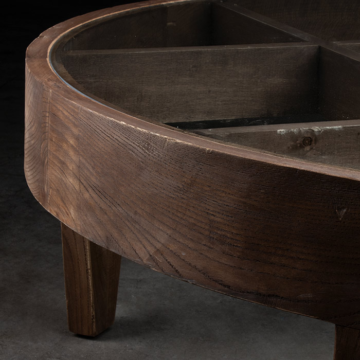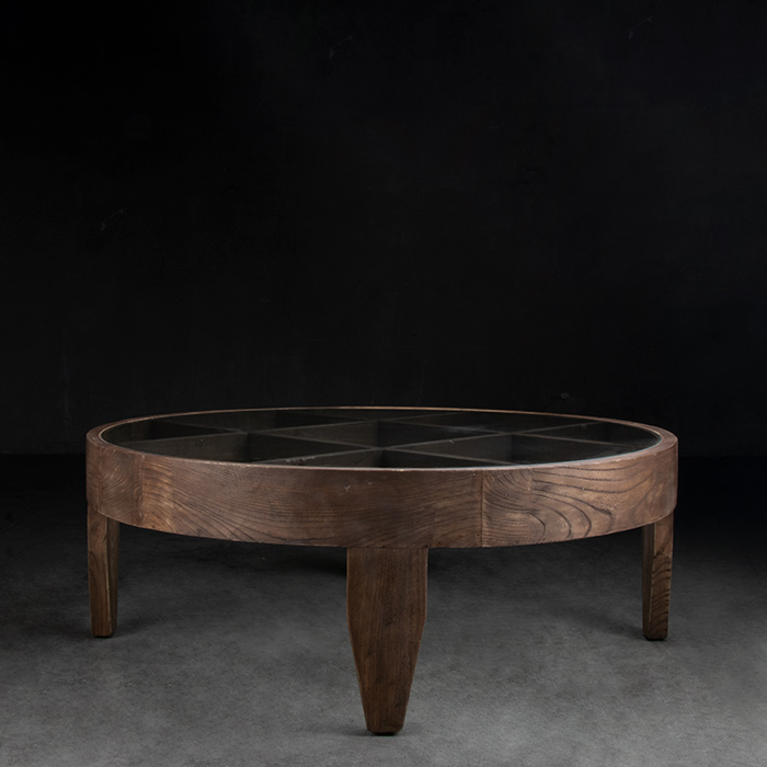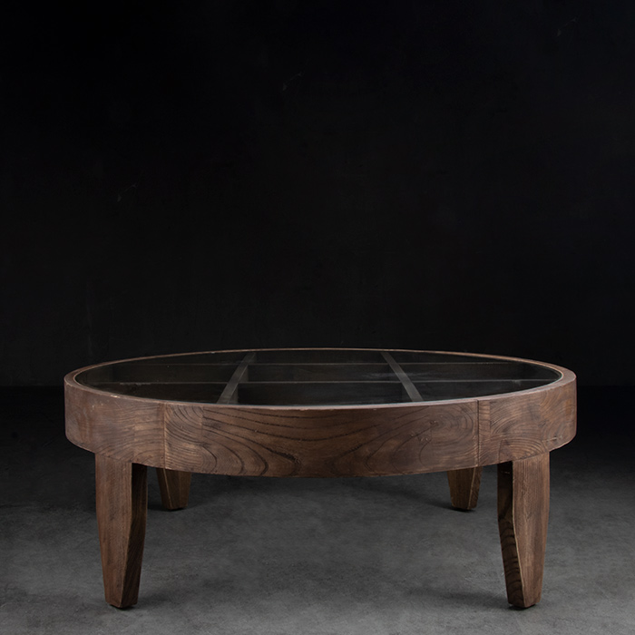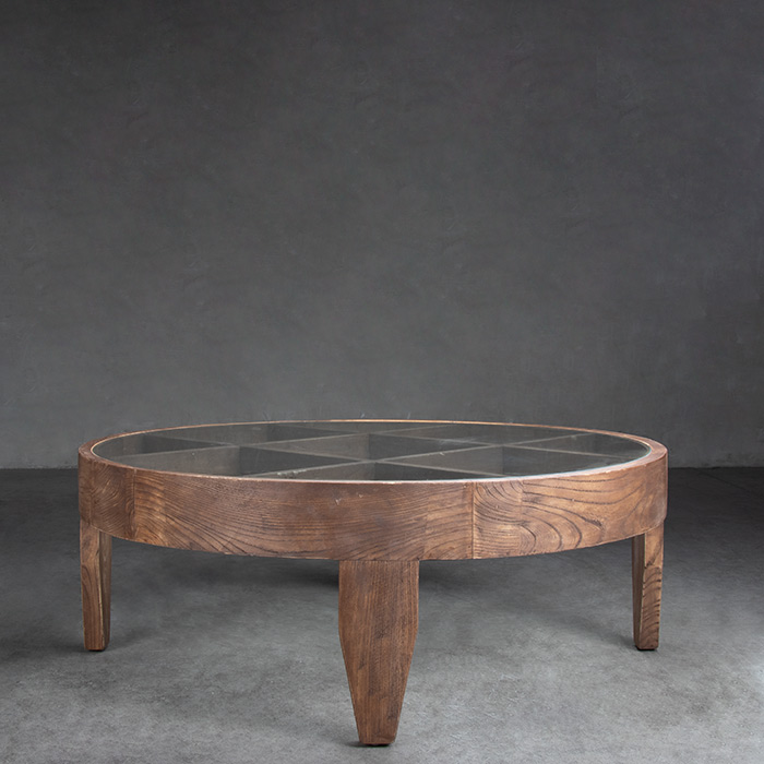 Mesa de centro de madera de olmo reciclado y cubierta de vidrio.