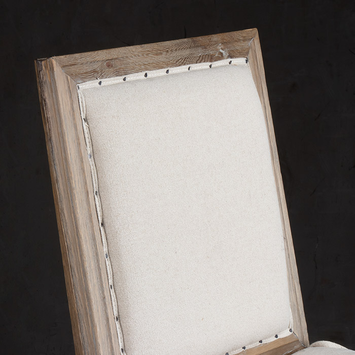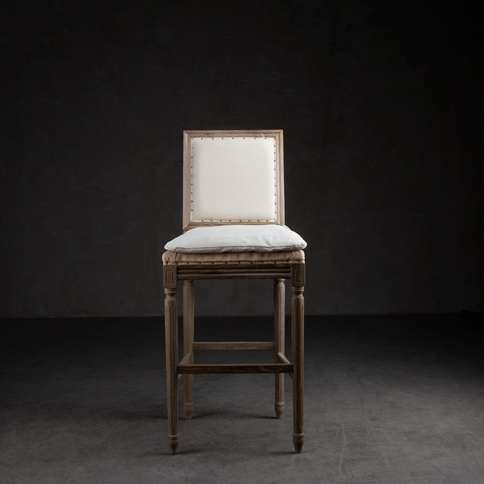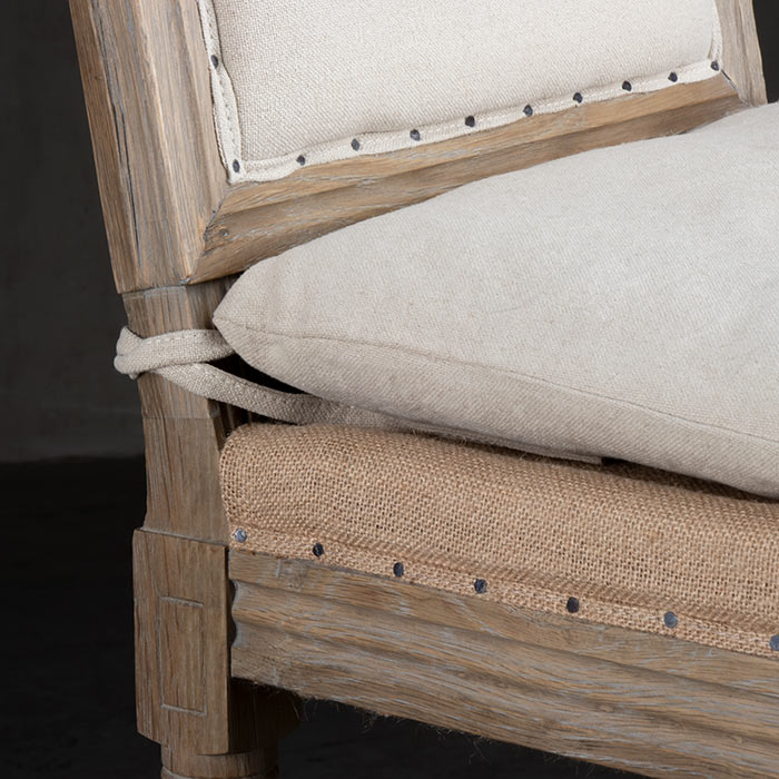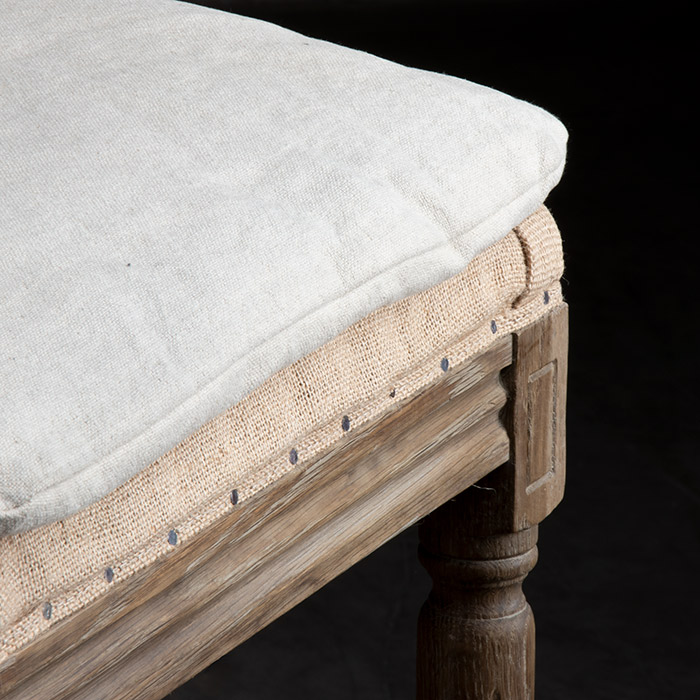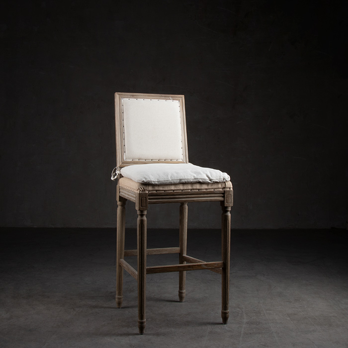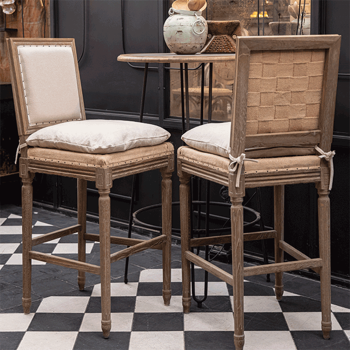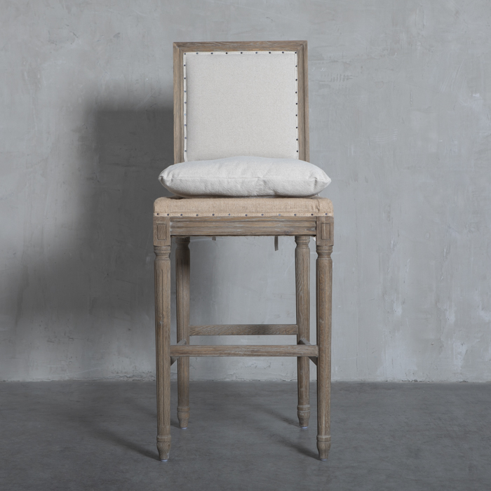 Piso Bar estructurado en madera de roble natural con cojín y respaldo de lino beige y forro de arpillera