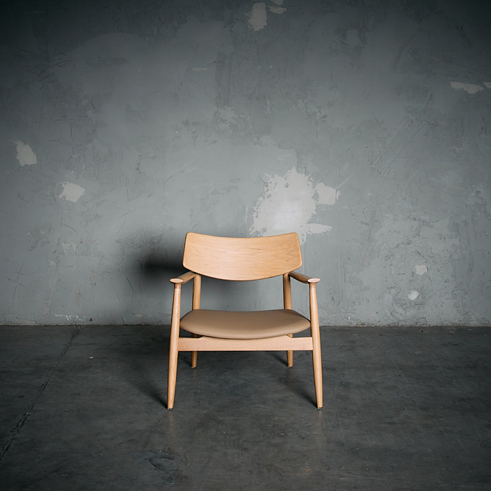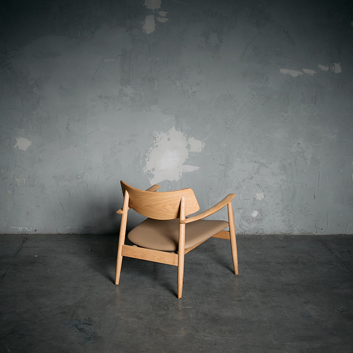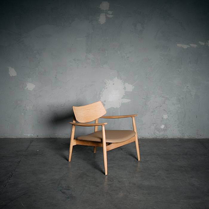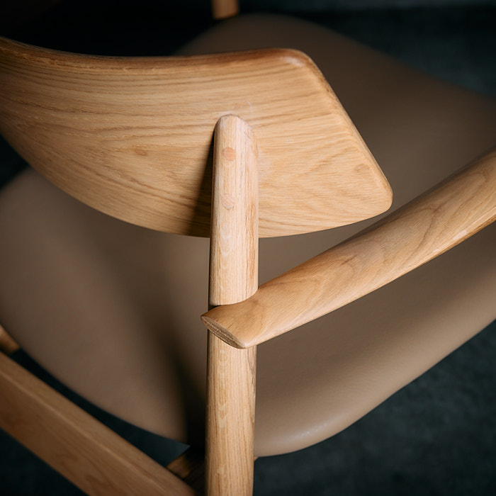 Poltrona fabricada con madera de roble americano en terminación natural y asiento de cuero natural en color beige.