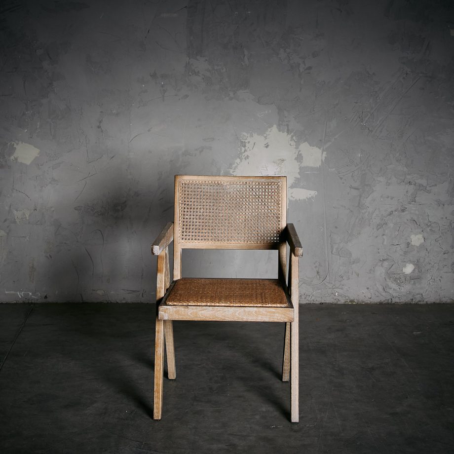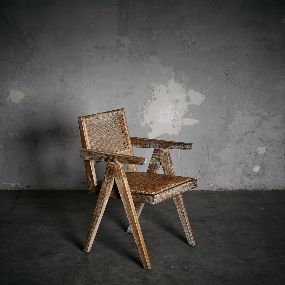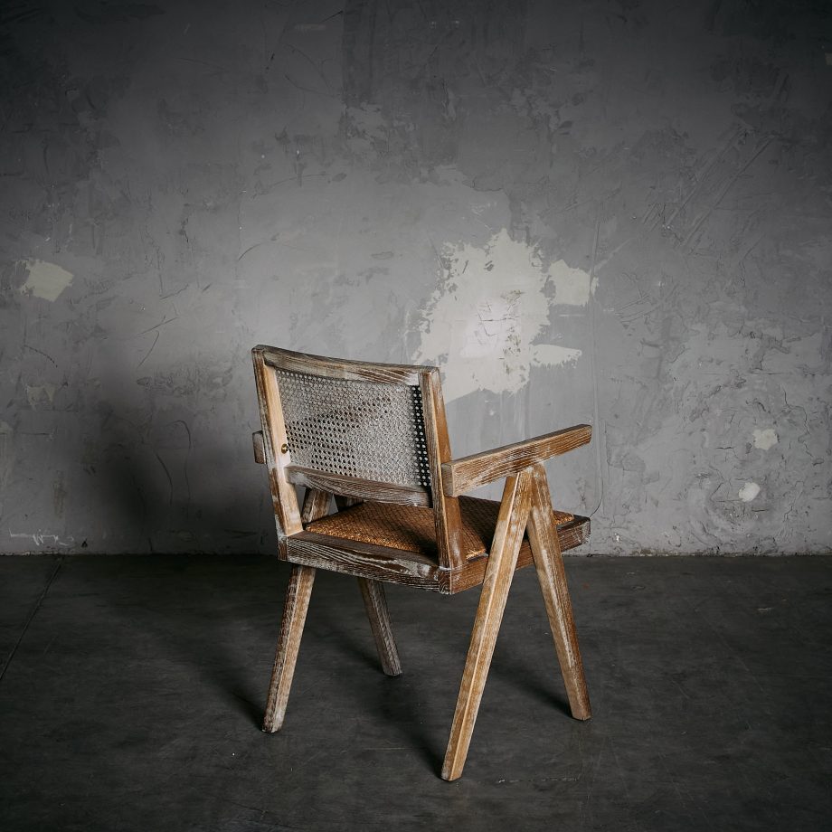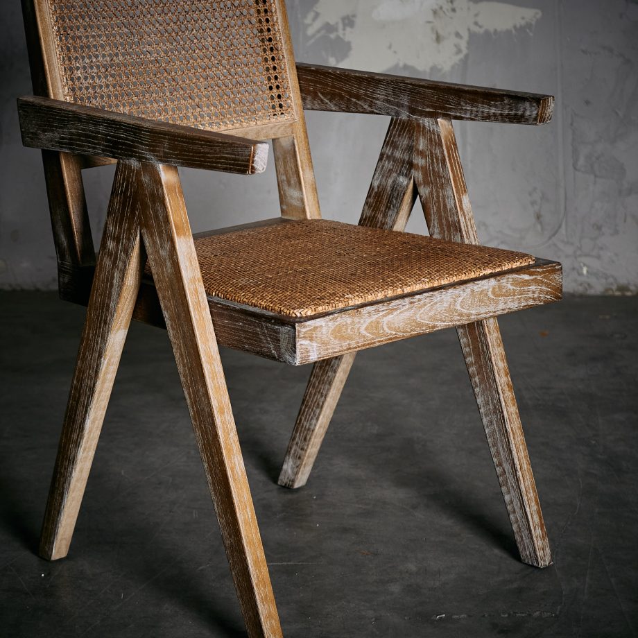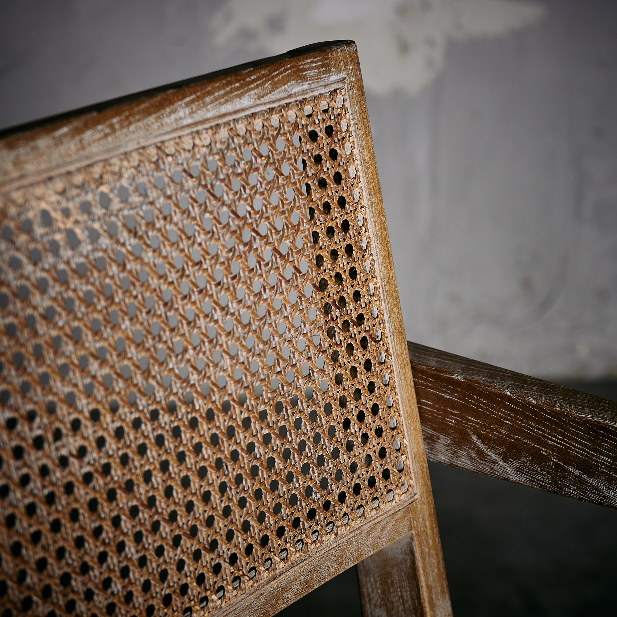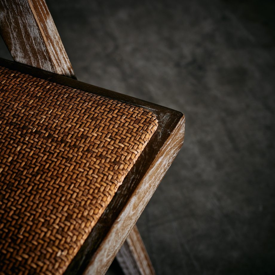 Sitial en Madera de Olmo en terminación nogal oscuro con asiento y respaldo tejidos en ratán con estructura de madera por debajo.