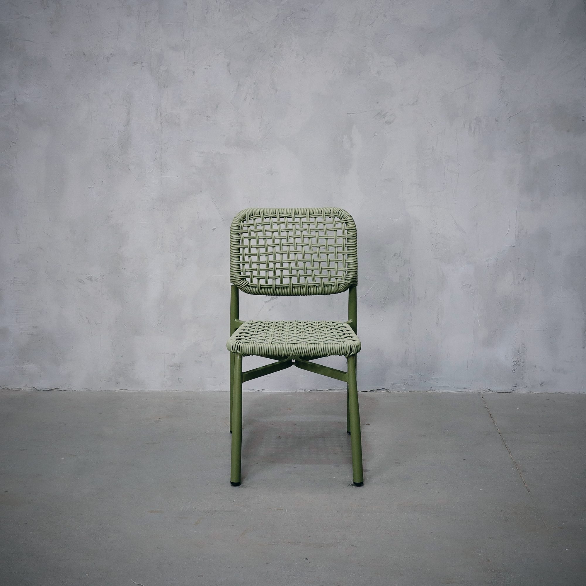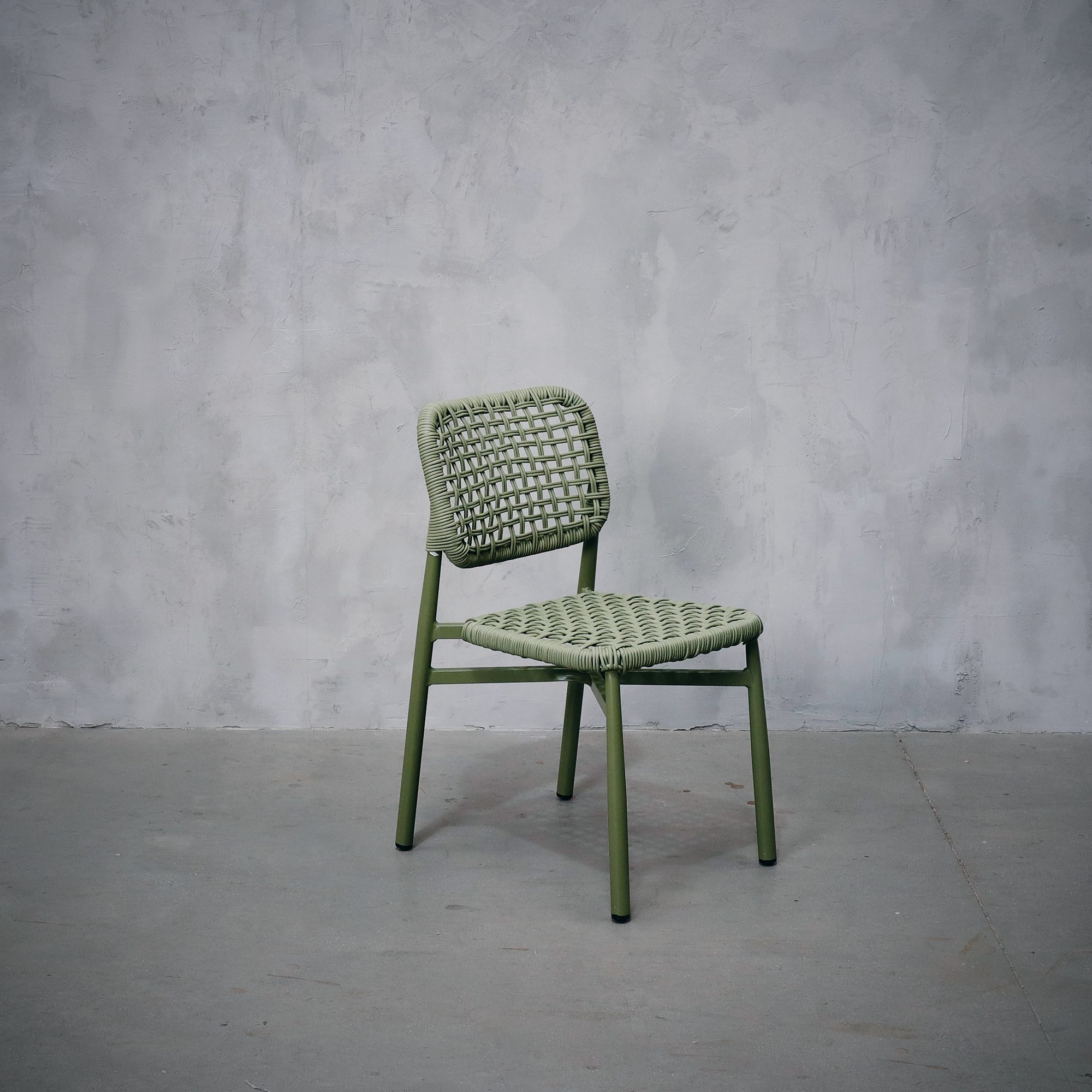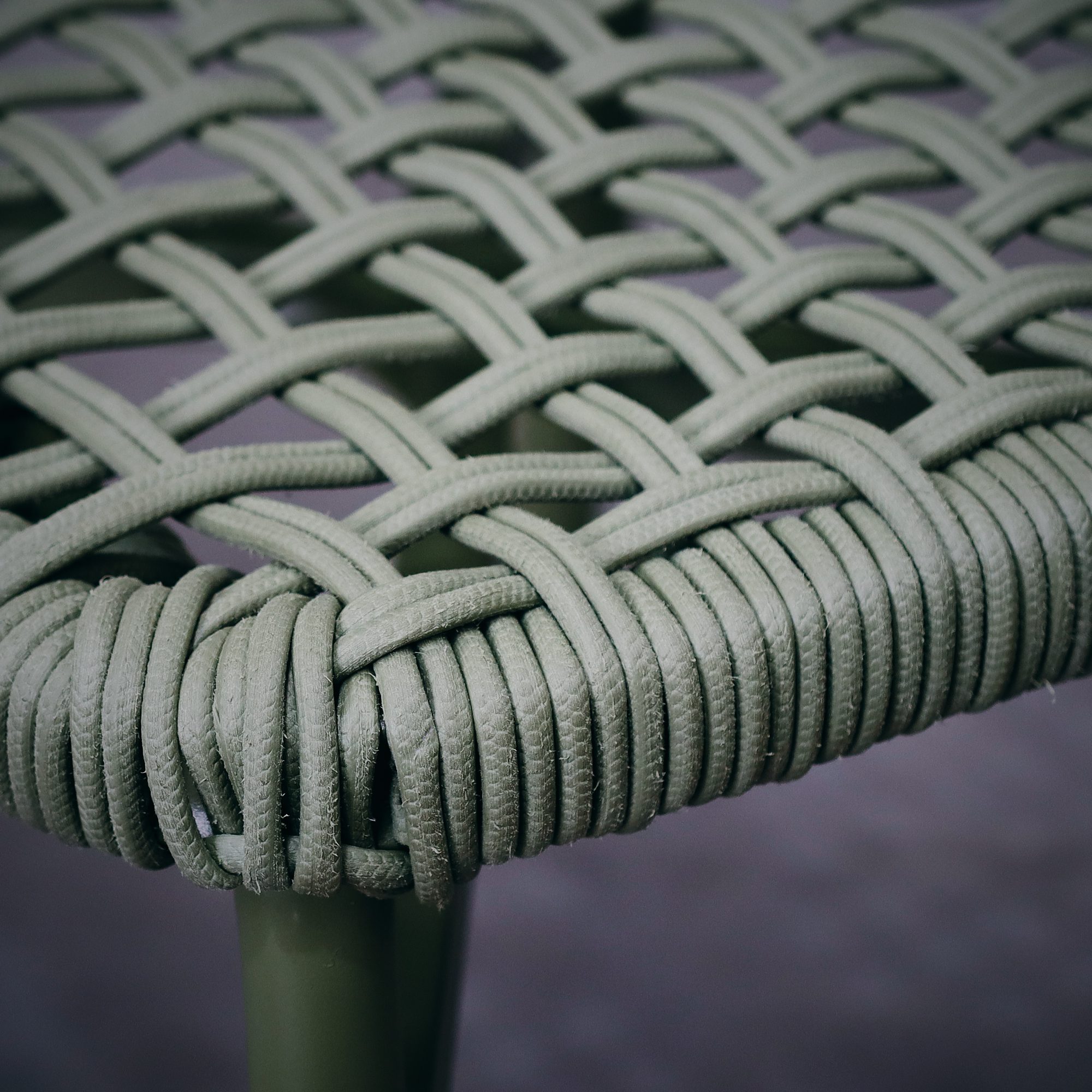 Silla elaborada con una estructura de aluminio y cuerda náutica en color verde. Este material destaca por ser muy resistente y ligero. Entre sus principales ventajas se encuentra su excelente resistencia a la humedad, lo que lo hace perfecto para mobiliario tanto de interior como exterior.