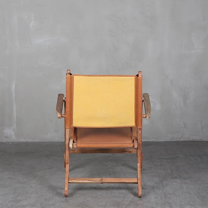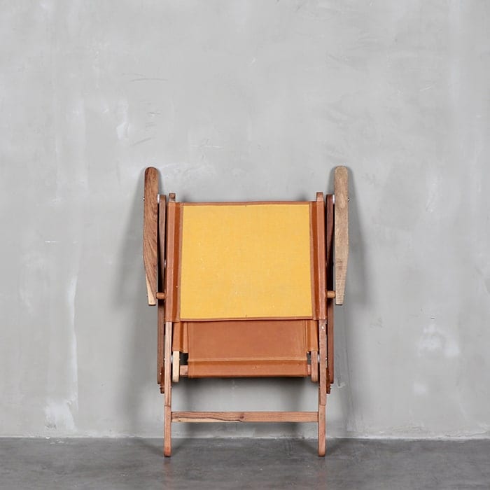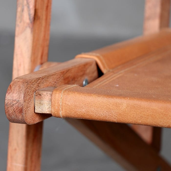 Sitial plegable con estructura de madera teca, asiento y respaldo de cuero.