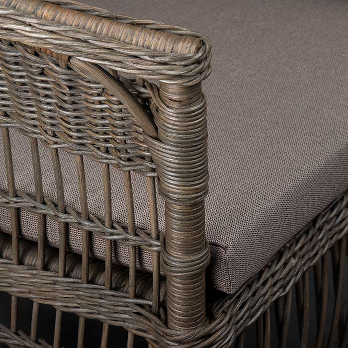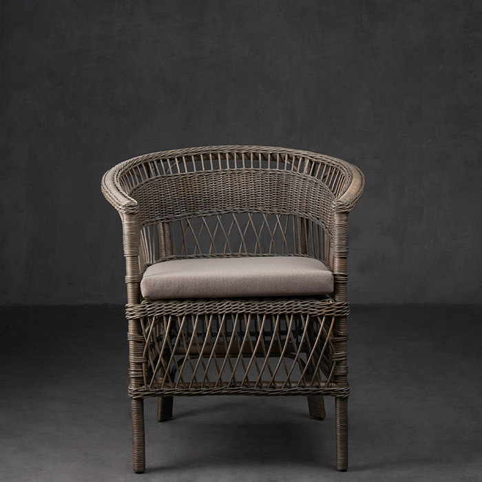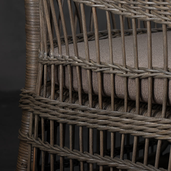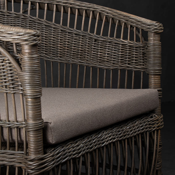 Silla de ratán en terminación gris. El cojín es de tela sunbrella color taupé.