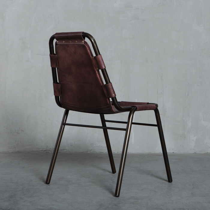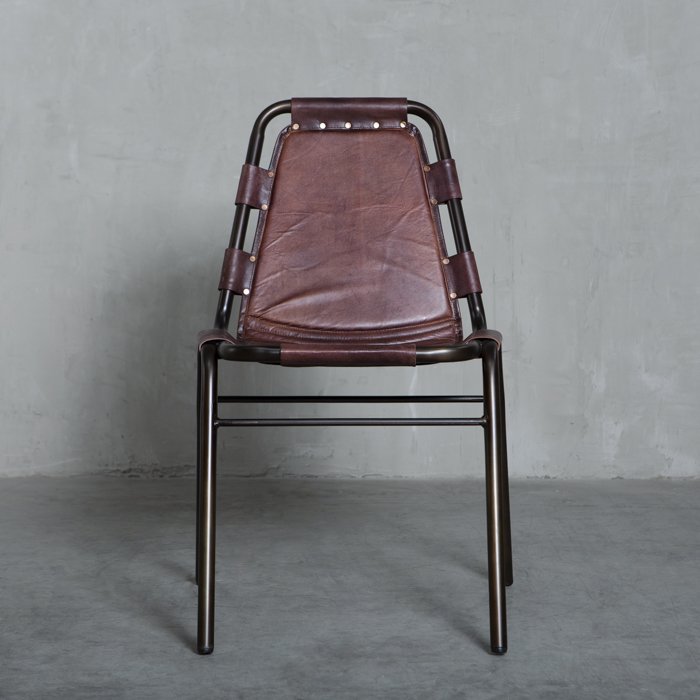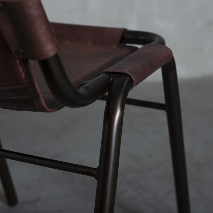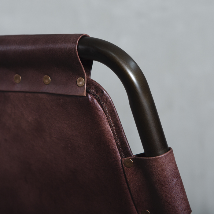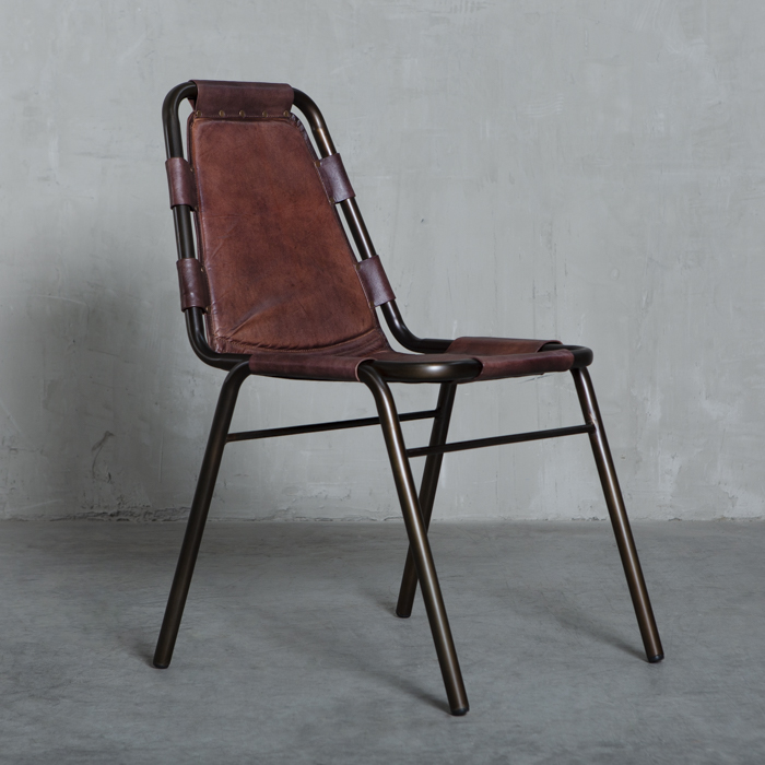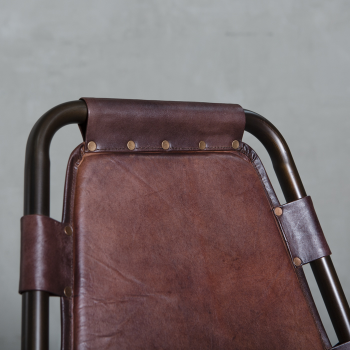 Silla con estructura metálica y asiento en cuero.