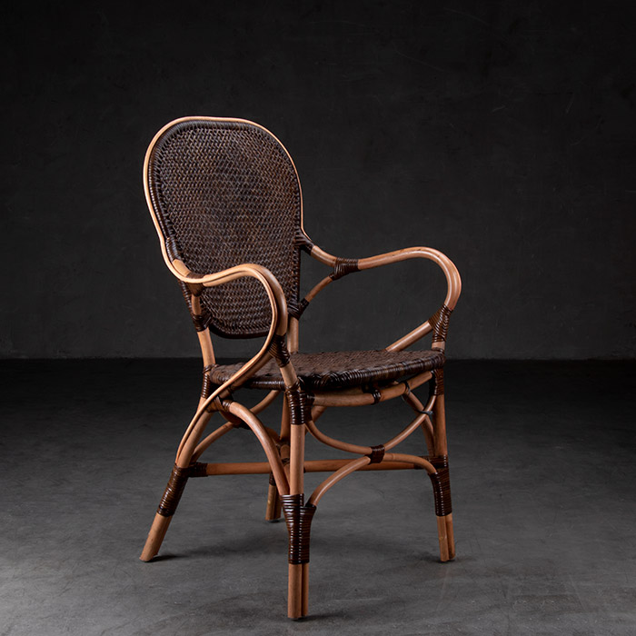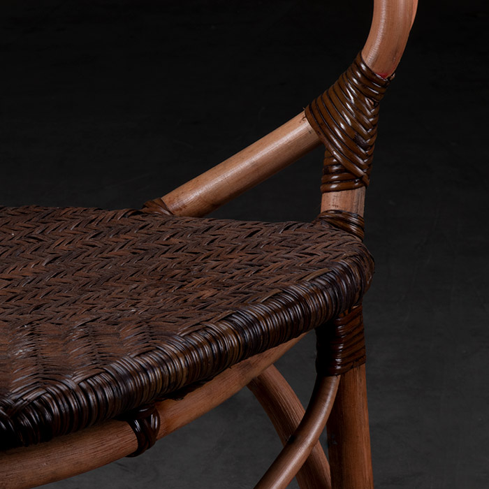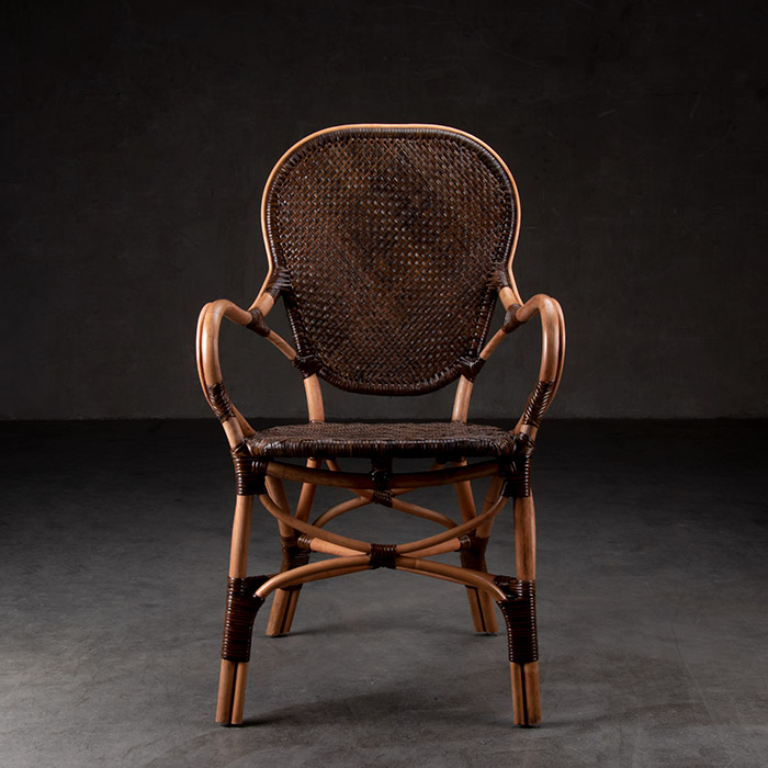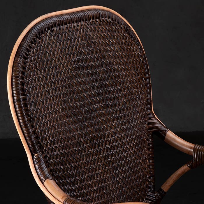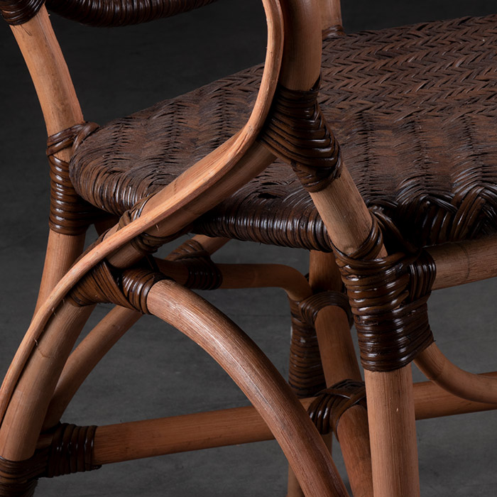Silla de estructura de ratán gruso en color natural. El asiento y el respaldo también son de estructura de ratán en terminación café oscuro.