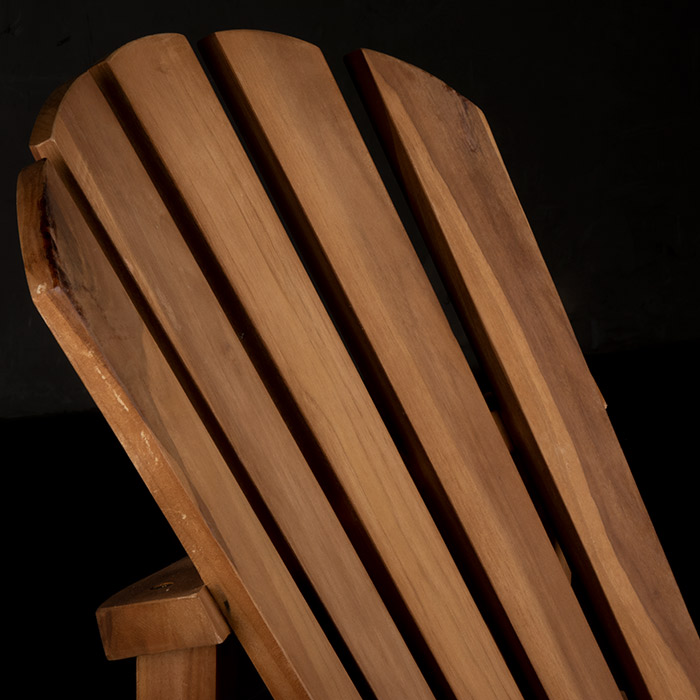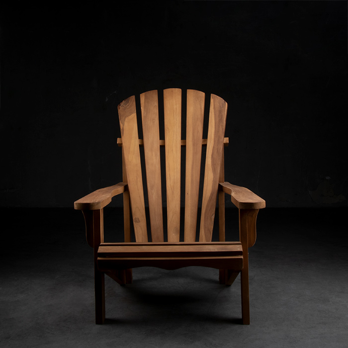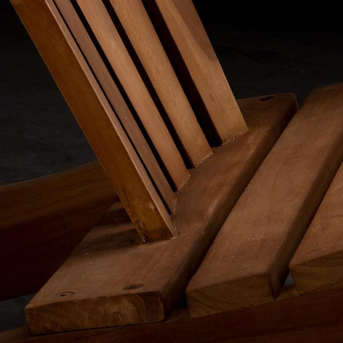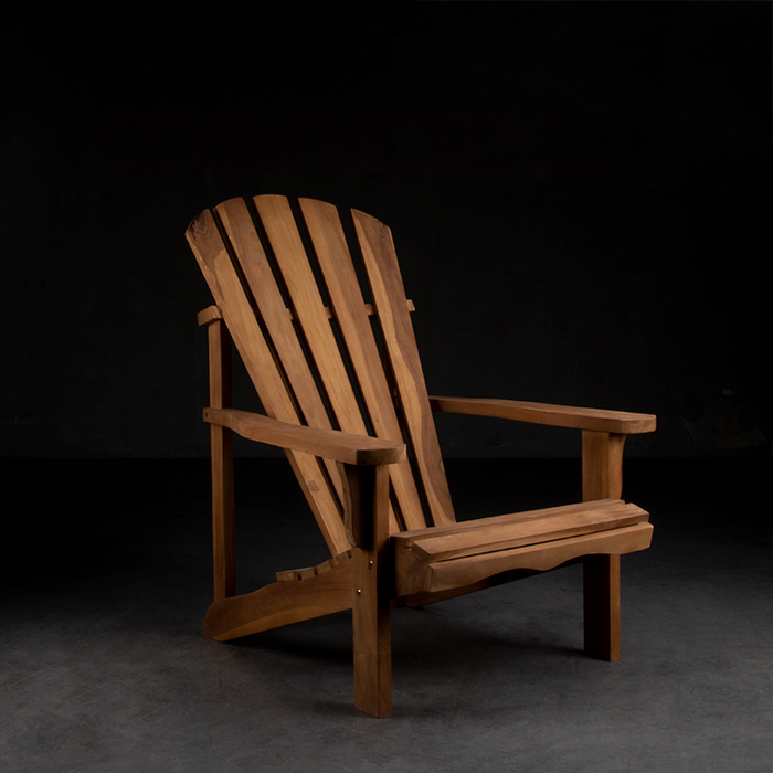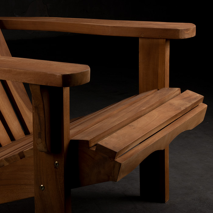 Poltrona de madera de teca. Esta poltrona puede estar totalmente expuesta al exterior. Con el sol y el agua la teca va tomando colores grisáseos naturales. Para su mantención, recomendamos hidratarla con aceite de teca una vez al año.