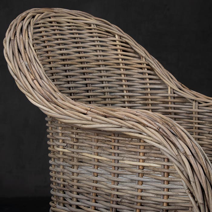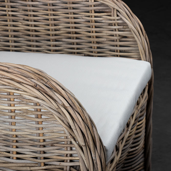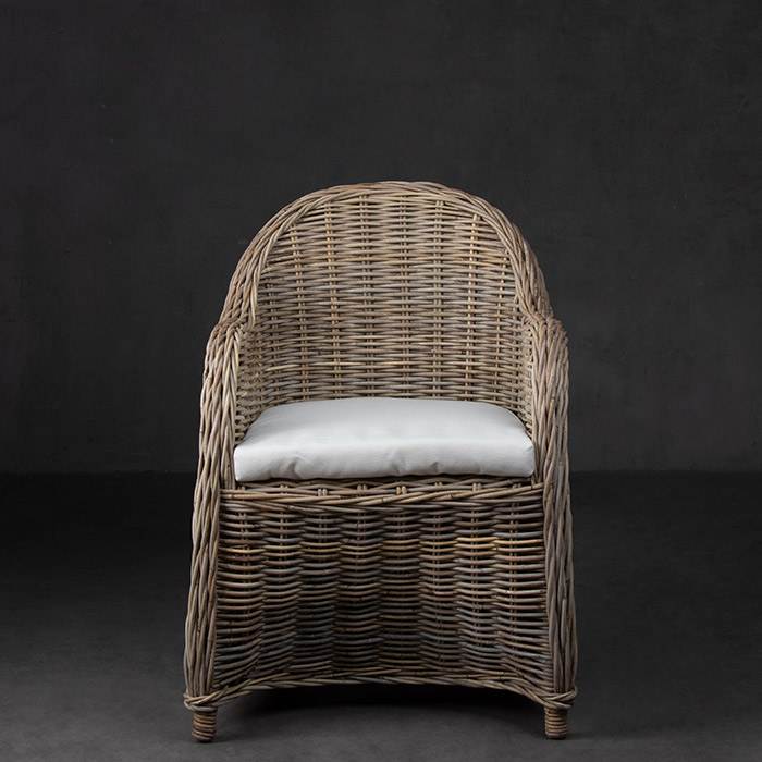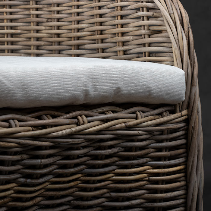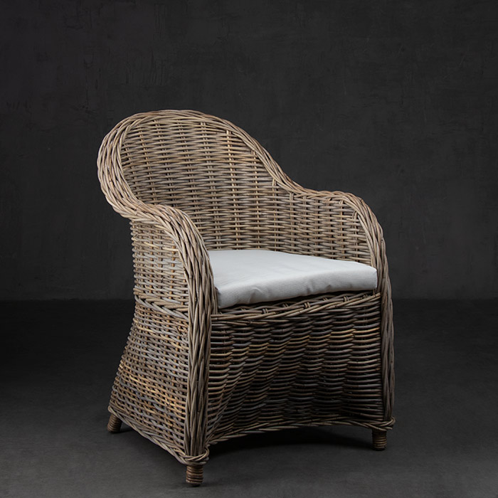 Silla de ratán en terminación gris. El cojin es de tela sunbrella color crudo.
