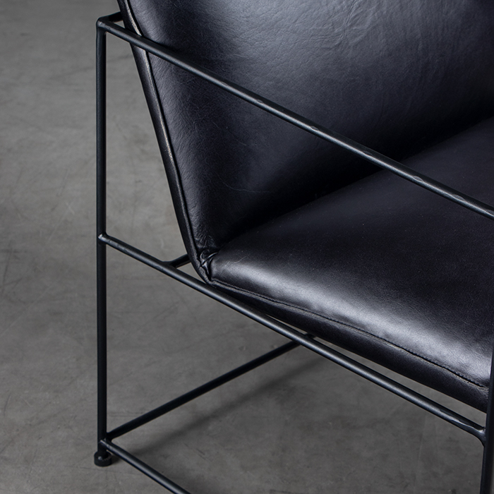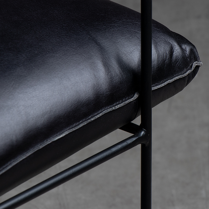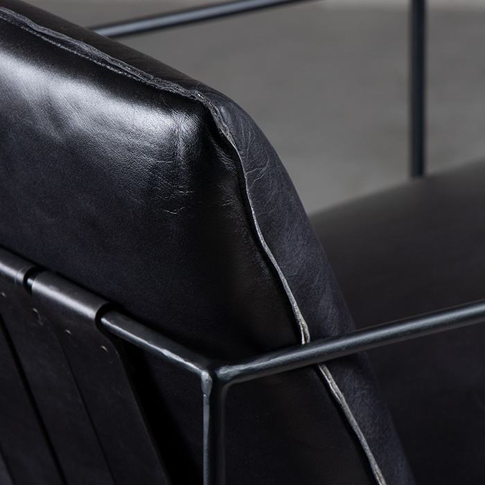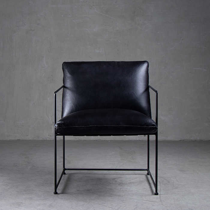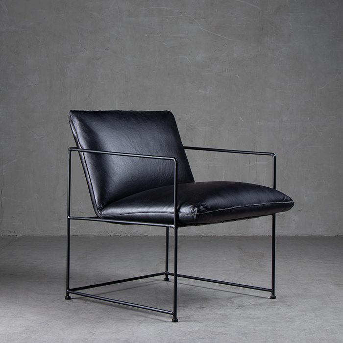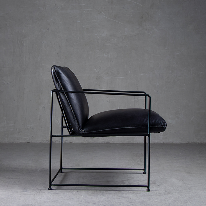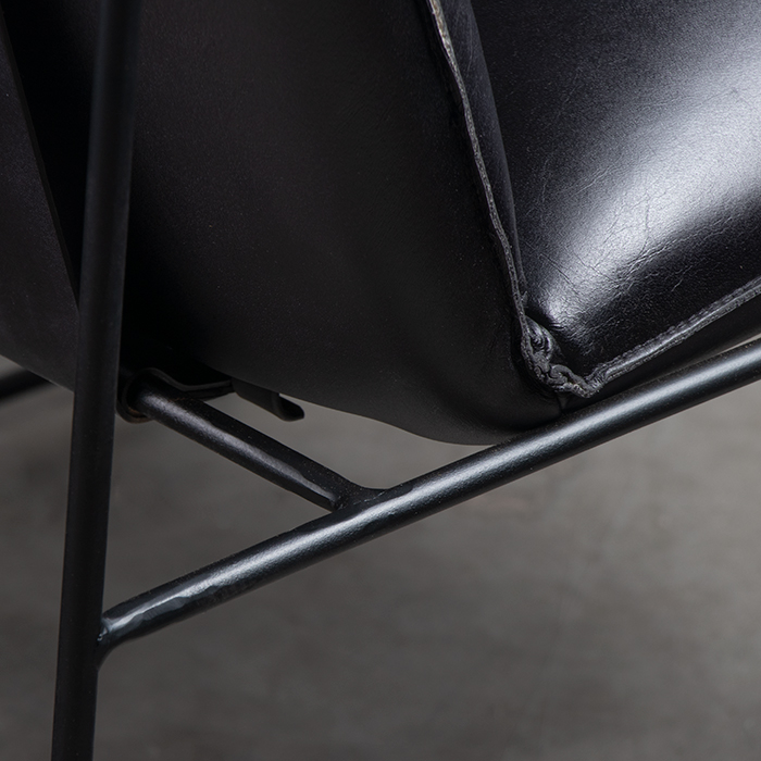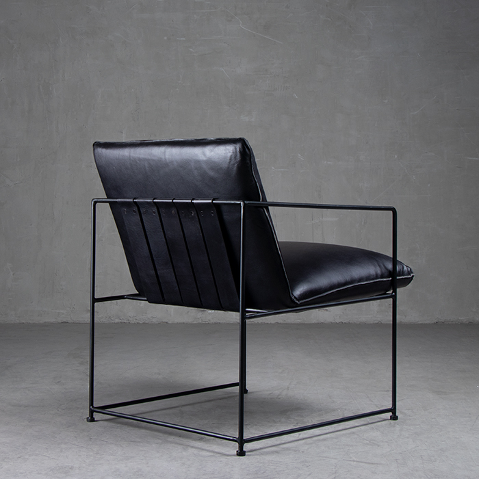 Poltrona con estructura de fierro, cuero de búfalo y relleno de espuma.