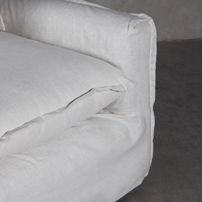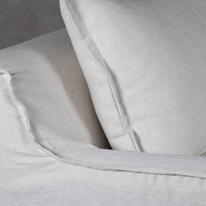 En su interior, el cojín del asiento incorpora una base de espuma de alta densidad 30 Súper Soft, complementada con un bolsillón superior relleno en una mezcla de 60% fibra Hollofil y 40% pluma. El resultado es una sensación de confort envolvente, con el equilibrio justo entre firmeza y suavidad. El cojín de respaldo, relleno completamente de Hollofil, aportan una sensación ligera, mullida y acogedora.
