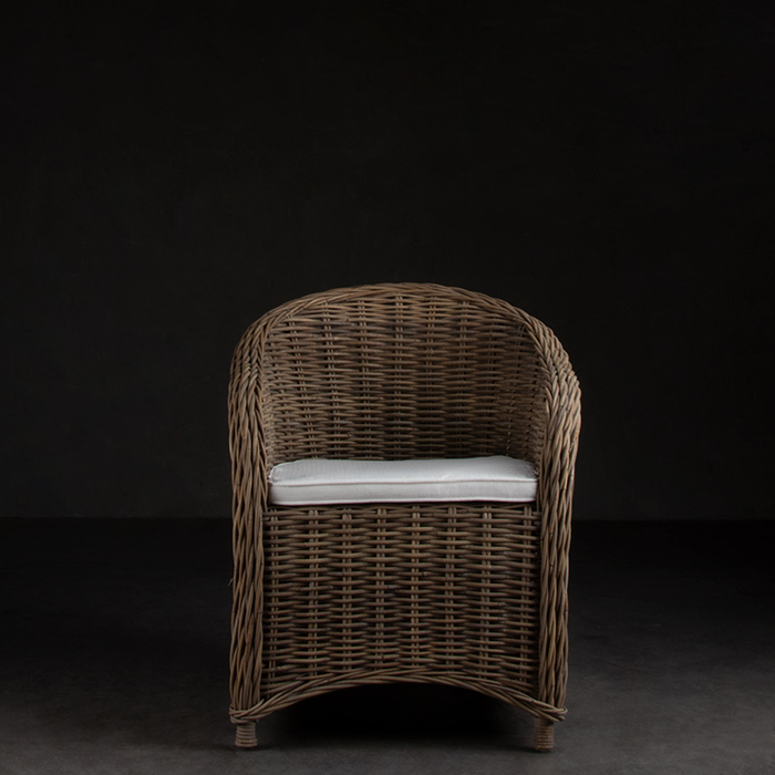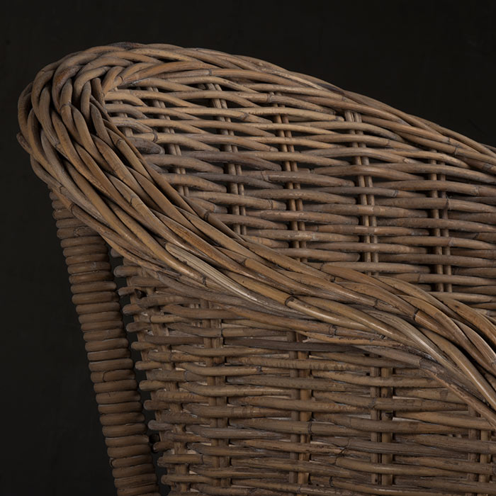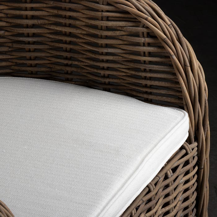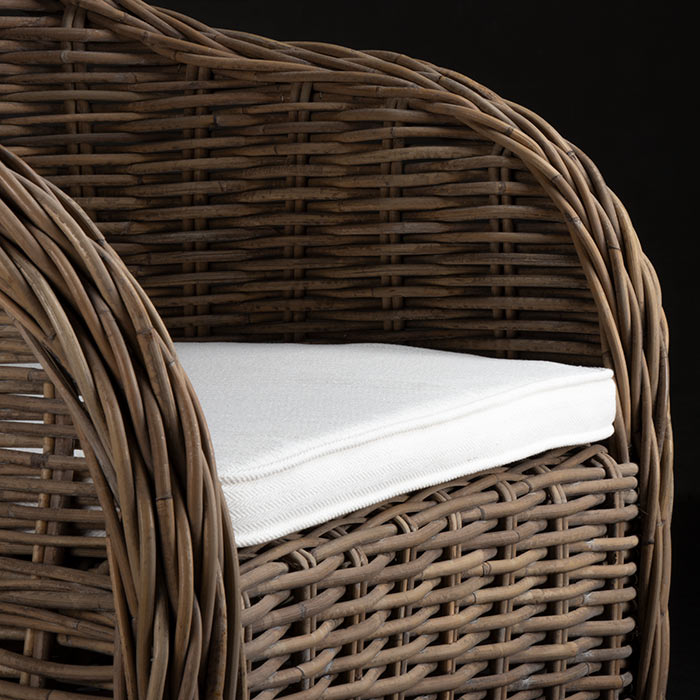 Sitial de rattan natural terminación gris claro . Diseño acogedor y cómodo que se caracteriza por su resistencia. Cuenta con un cojín de algodón para potenciar la comodidad.