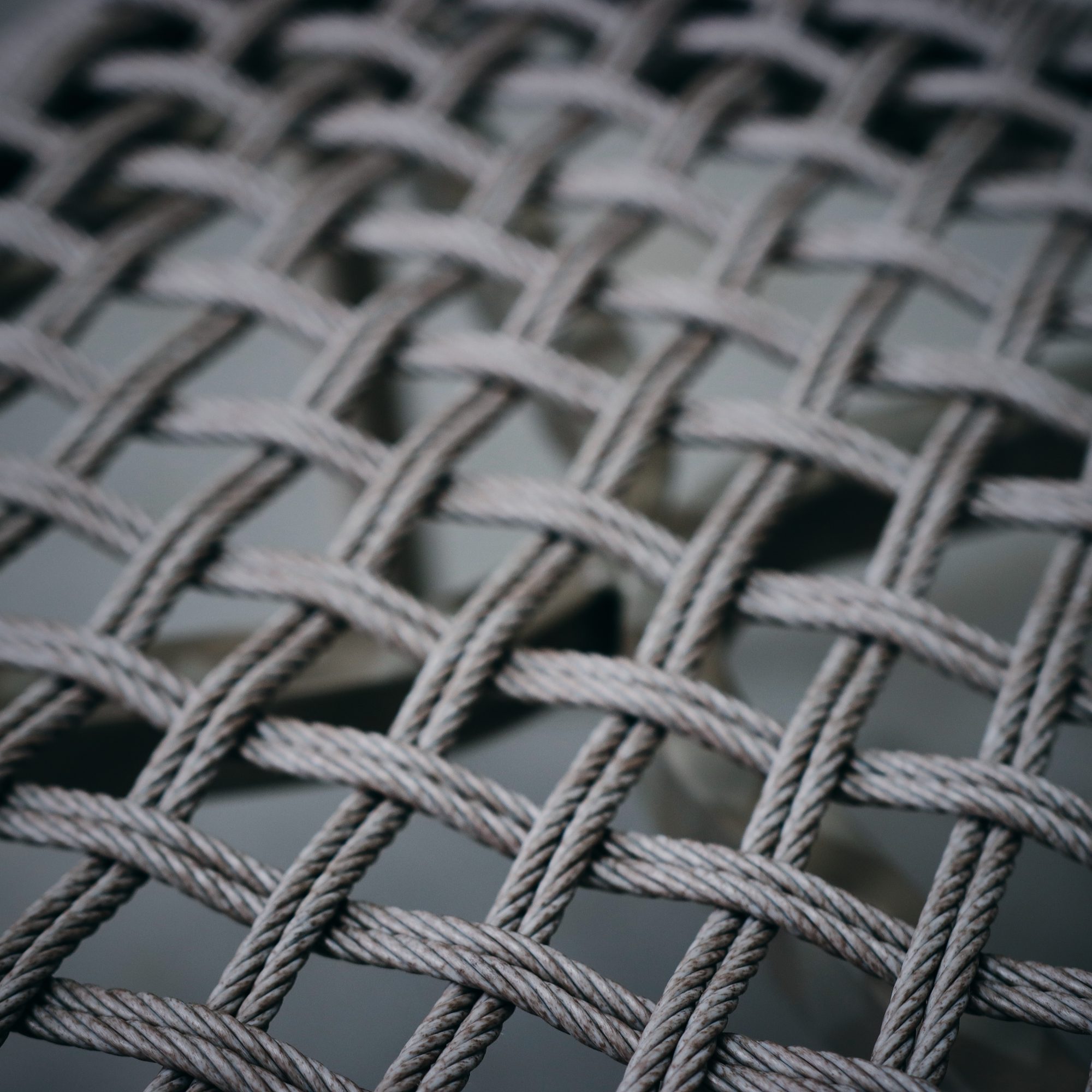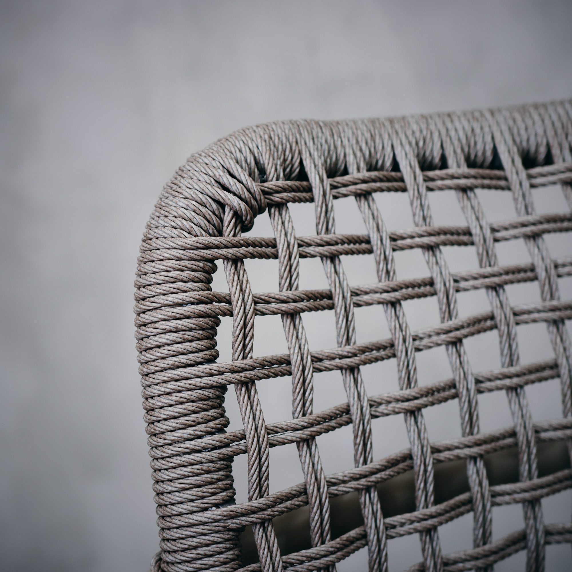 Silla elaborada con una estructura de aluminio y cuerda náutica en color beige. Este material destaca por ser muy resistente y ligero. Entre sus principales ventajas se encuentra su excelente resistencia a la humedad, lo que lo hace perfecto para mobiliario tanto de interior como exterior.