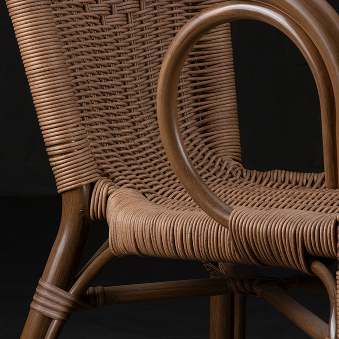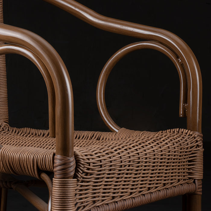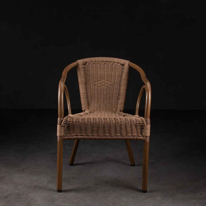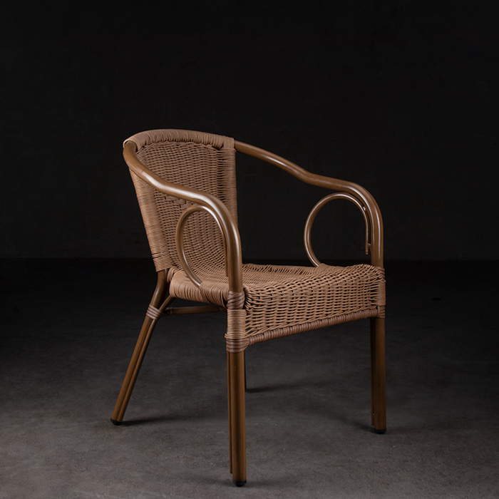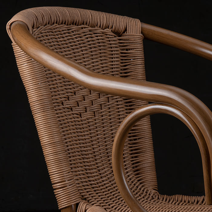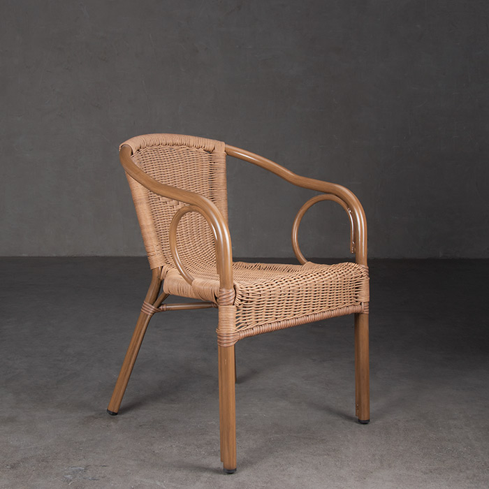 Silla de estructura de aluminio con terminación bambú. El tejido es de fibra sintética, lo cual lo hace ideal para lugares expuestos al agua y sol. Es una silla de alto tráfico.