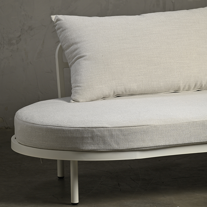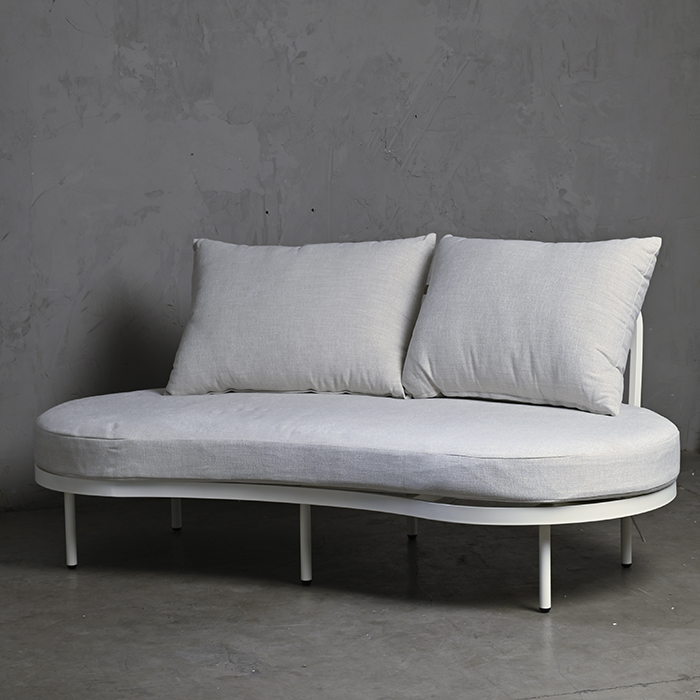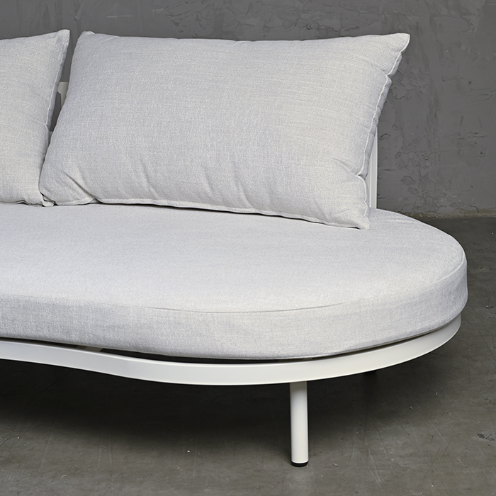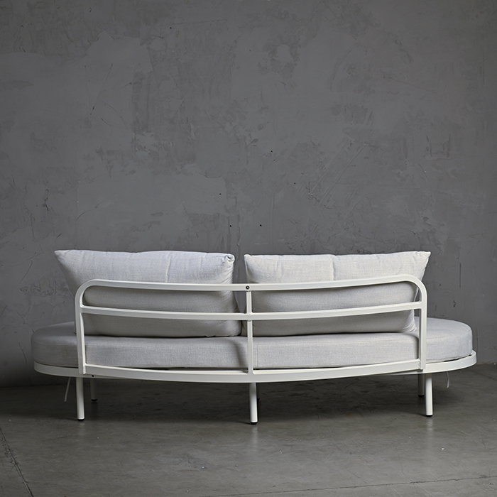 Sofá curvo de aluminio y tela sunbrella en terminación blanco.