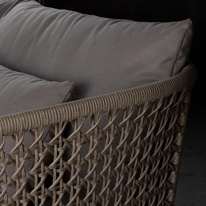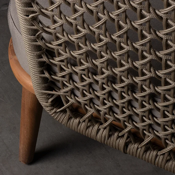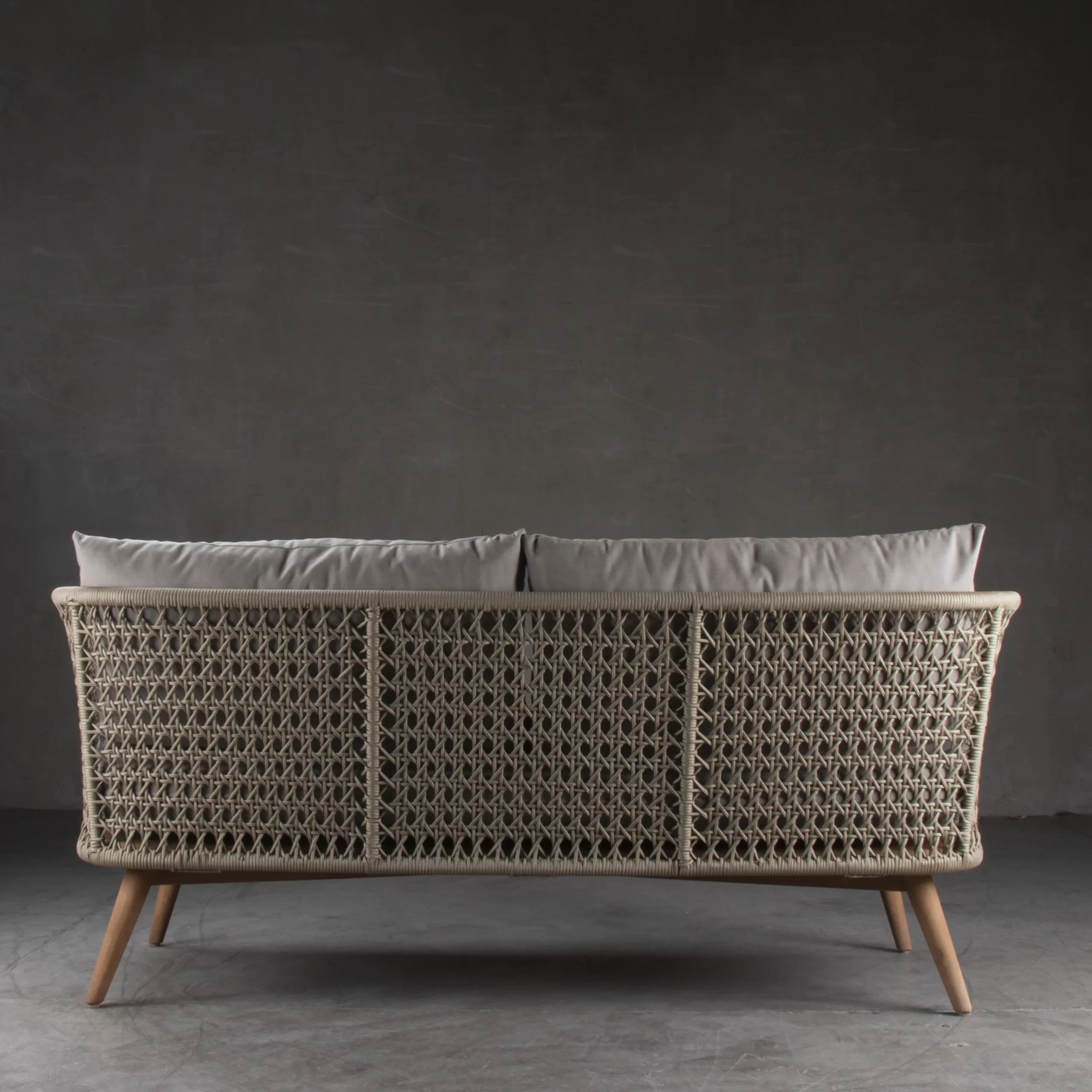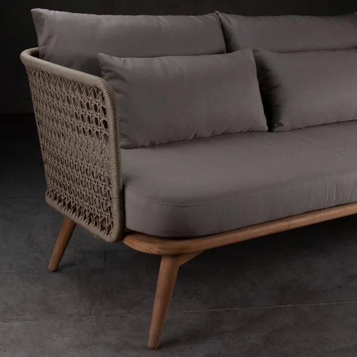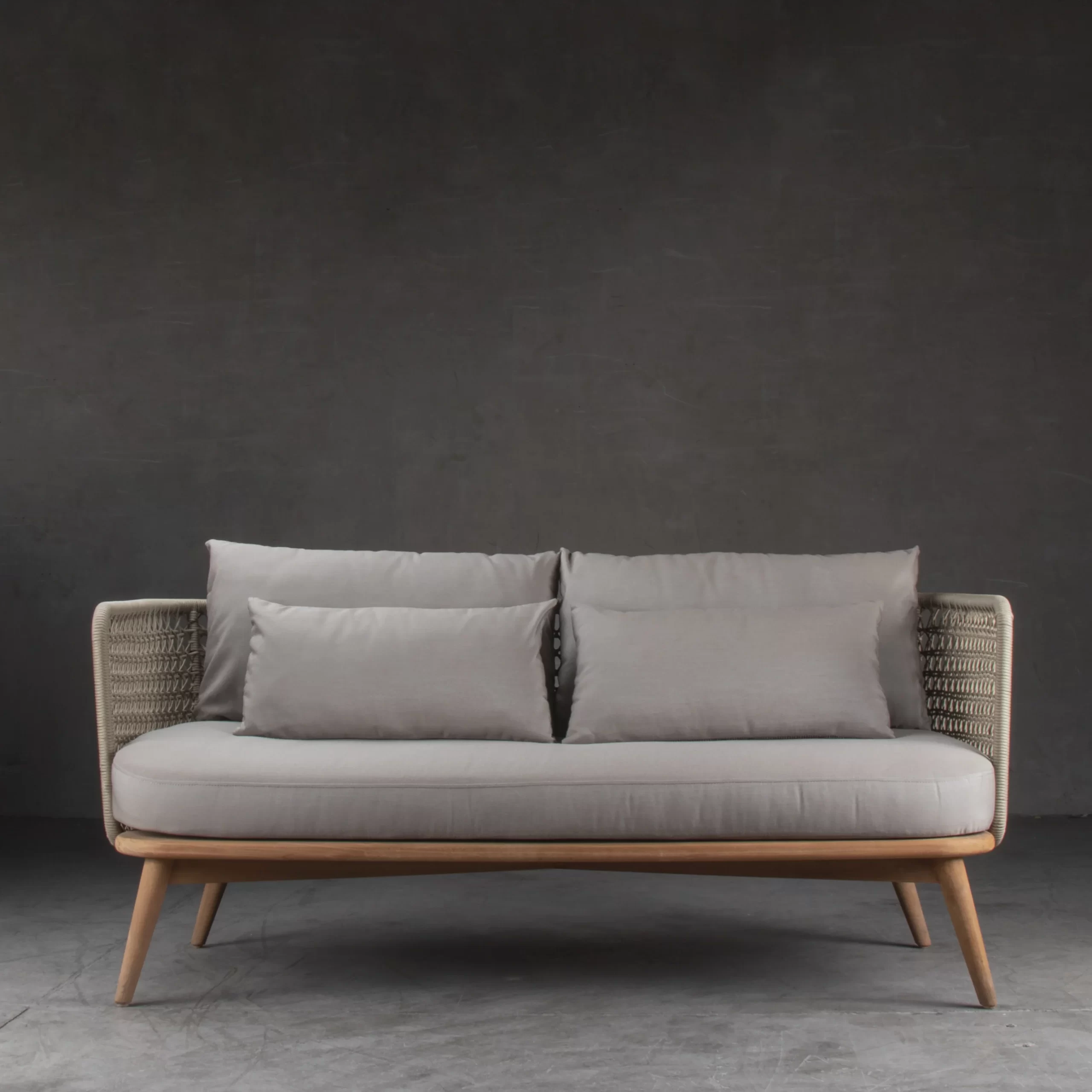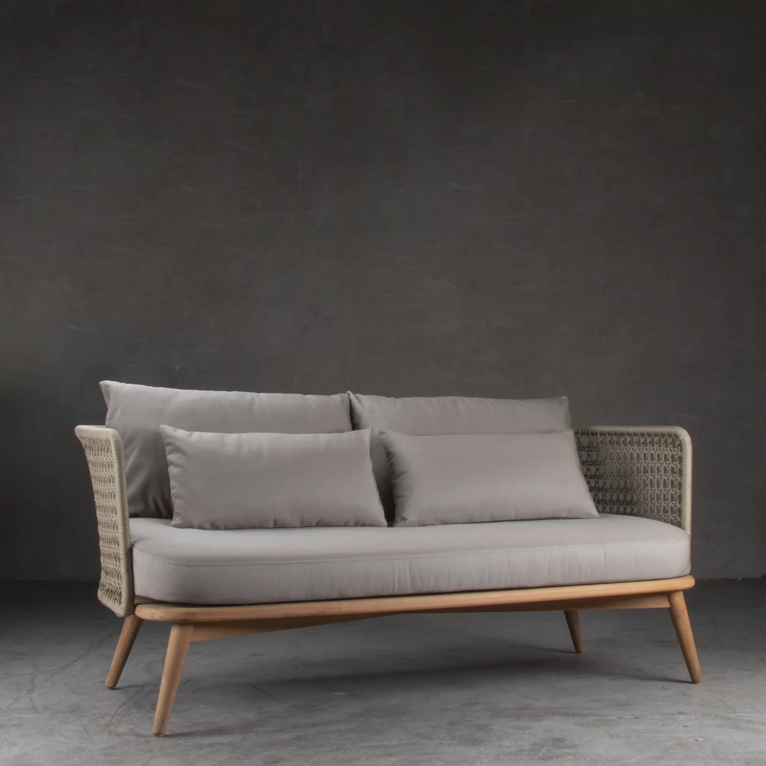 Sofá fabricado en madera de Teca, tela Sunbrella y cuerda de alta resistencia, ideal para exterior.