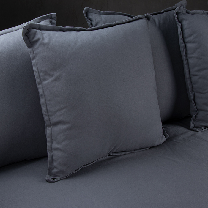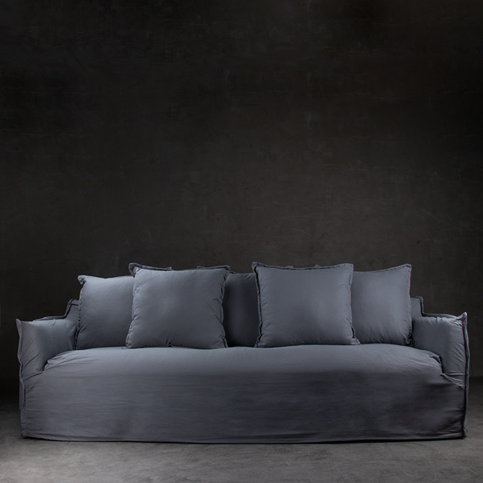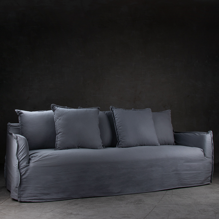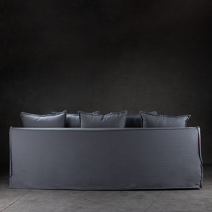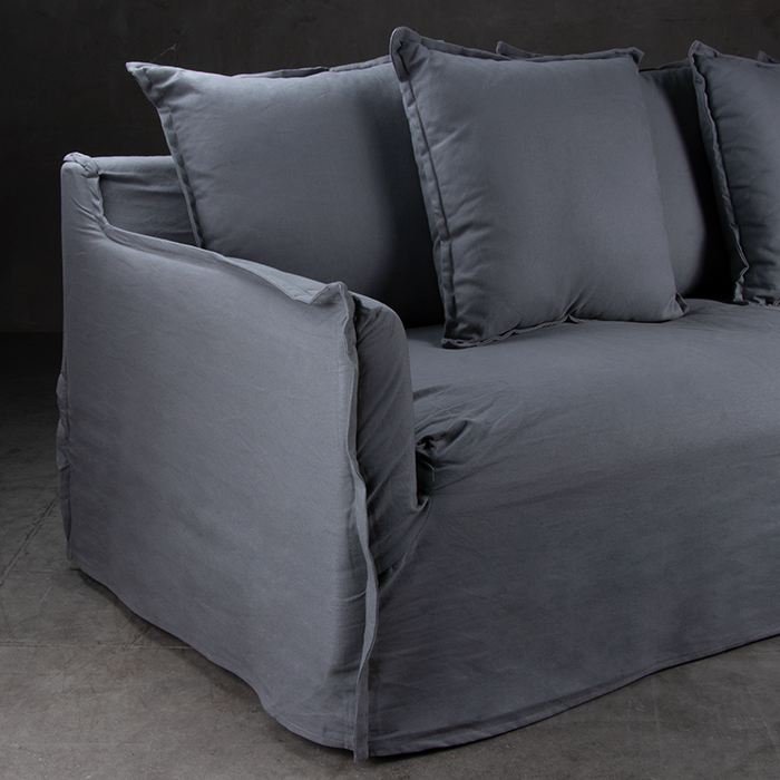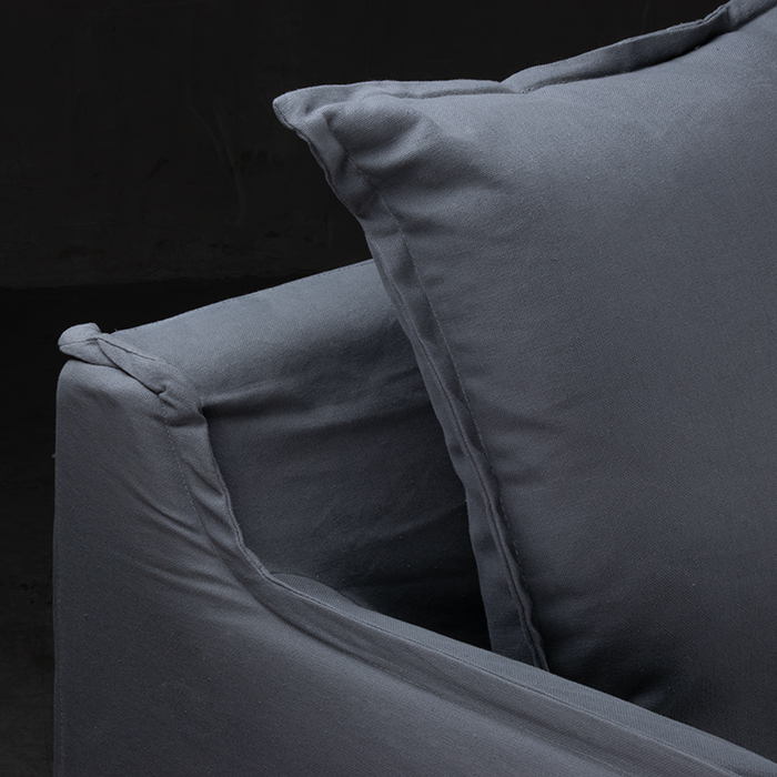 Sofá 55% lino – 45% algodón. Estructura de pino. Cojín del asiento espuma de alta densidad , pluma y algodón sintético.